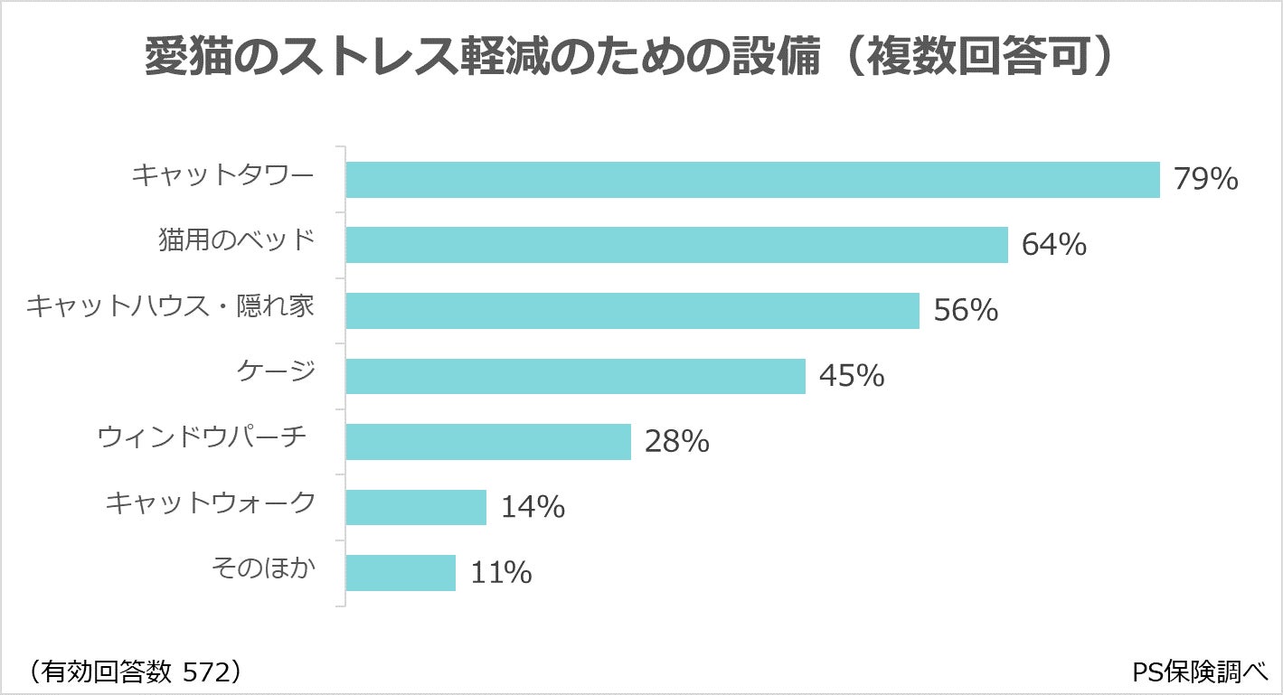 ・愛猫のストレス軽減のために最も支持される設備は、キャットタワー(79%)。
