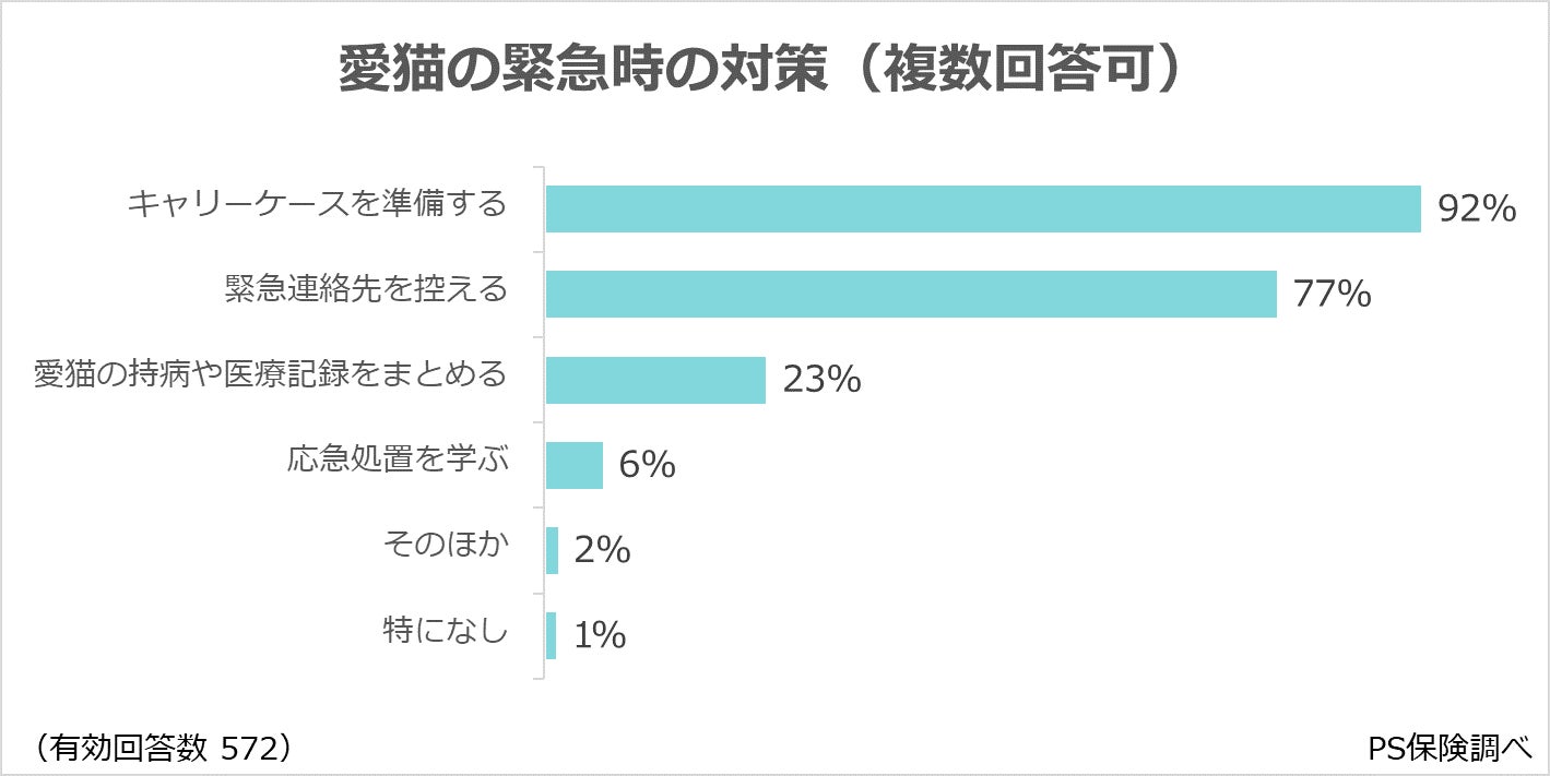 また、緊急時の対策として、キャリーケースの準備や緊急連絡先の確認が行われています。しかし、愛猫の持病や医療記録の整理、応急処置の習得を行っている飼い主は少数派であり、改善の余地があります。