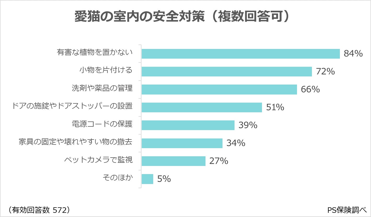 ・室内で過ごす愛猫の安全対策は、「有害な植物を置かない」(84%)が最多。