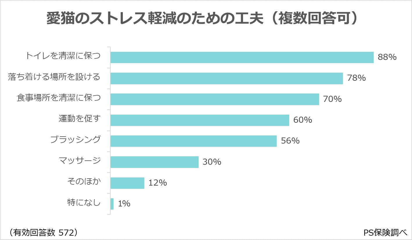 また、「運動を促す」(60%)や「ブラッシング」(56%)など、身体的なケアを重視する飼い主も多いようです。さらに、「マッサージ」(30%)、「そのほか」(12%)と続きます。一方、「特になし」と回答したのは1%で、ほとんどの飼い主が、愛猫のストレス軽減に対し、積極的に取り組んでいることが明らかとなりました。