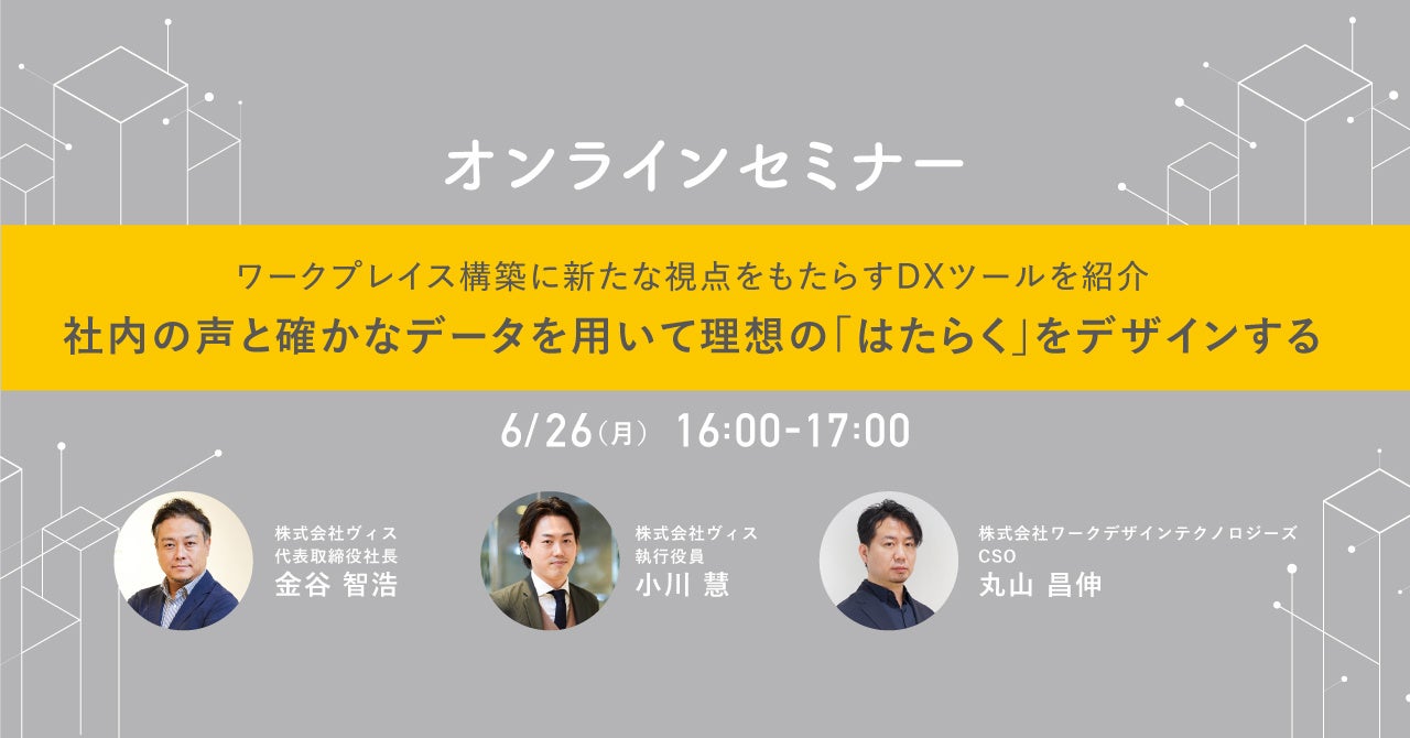 今回のセミナー「ワークプレイス構築に新たな視点をもたらすDXツールを紹介 ー社内の声と確かなデータを用いて理想の『はたらく』をデザインするー」では、「WORK DESIGN PLATFORM」の開発背景や実際の機能・仕様を紹介し、ヴィスでの事例をもとに実際の数値や分析結果をご覧いただきます。