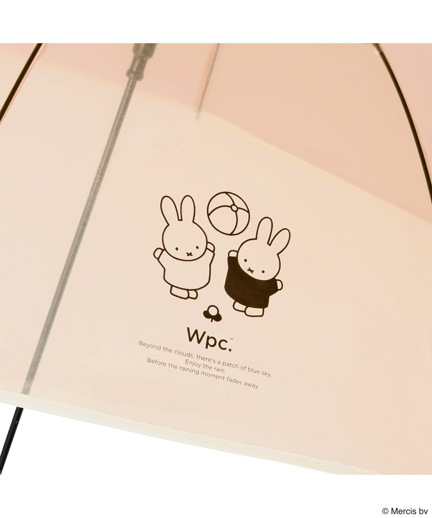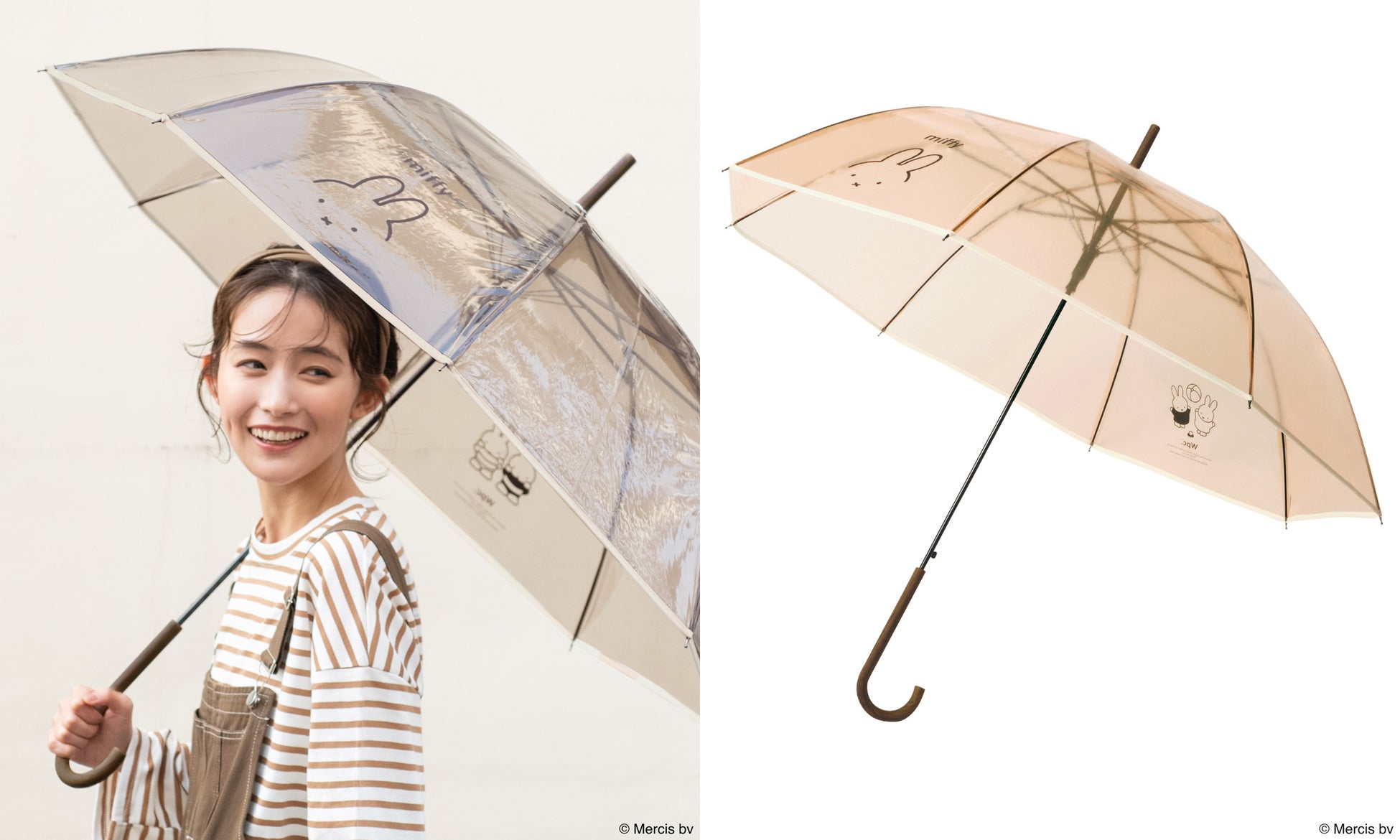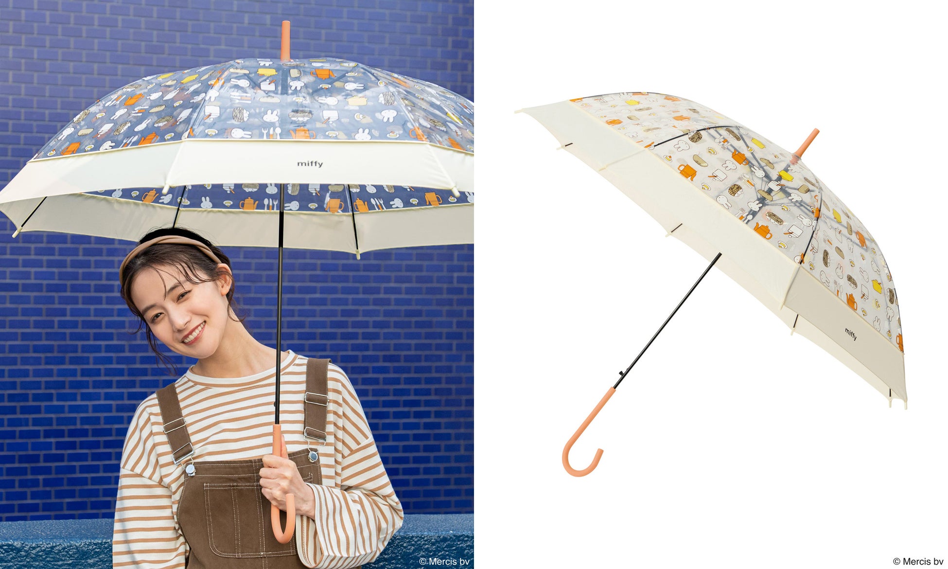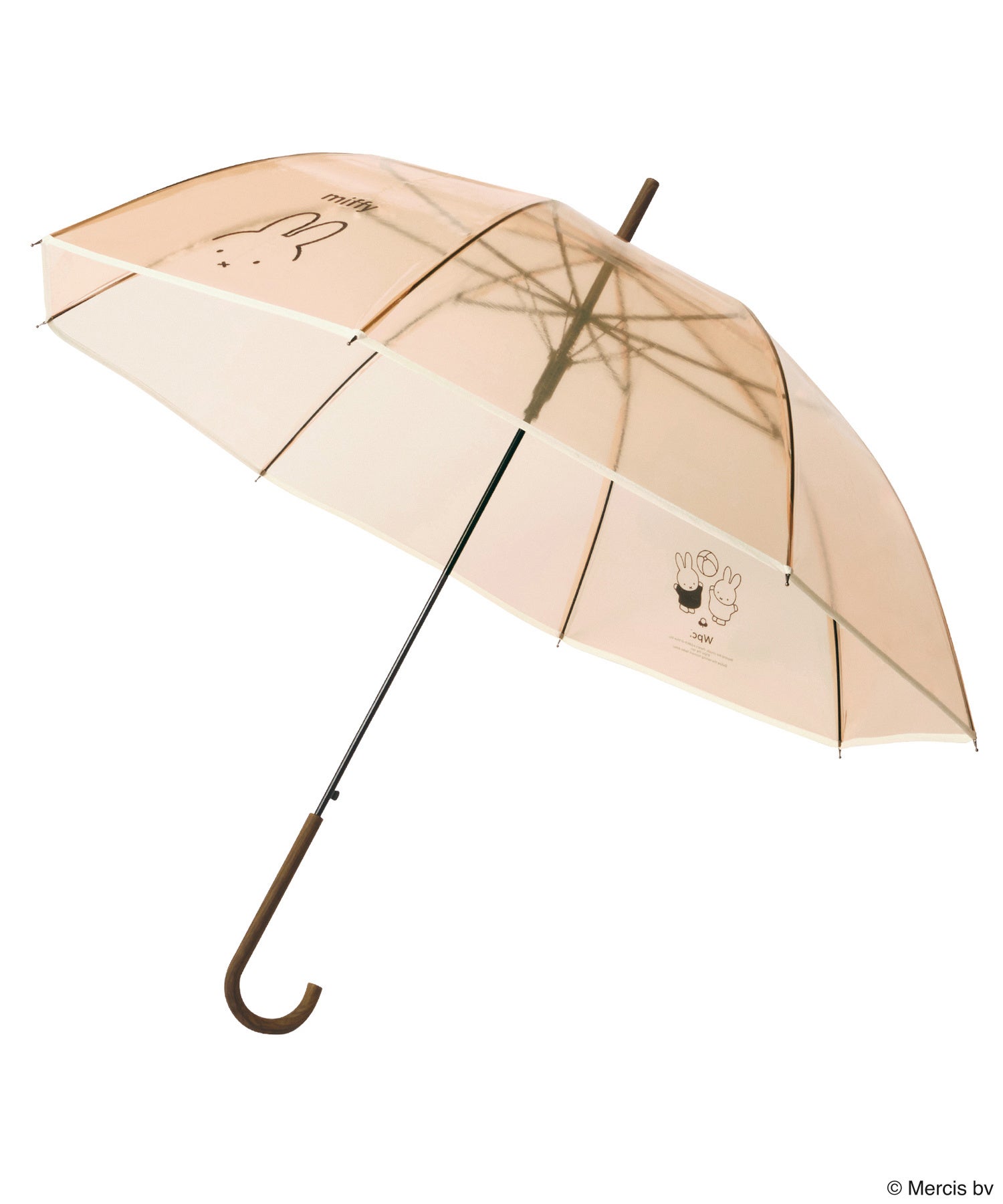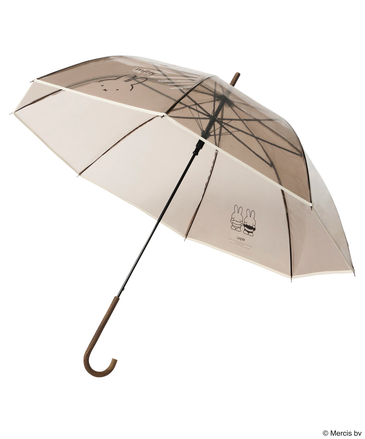可愛い顔をのぞかせるミッフィーなど、前後にワンポイントが入ったビニール傘。ブラウンとオレンジの2色の生地にウッド調の持ち手を合わせて、普段使いしやすい優しいトーンに仕上げました。