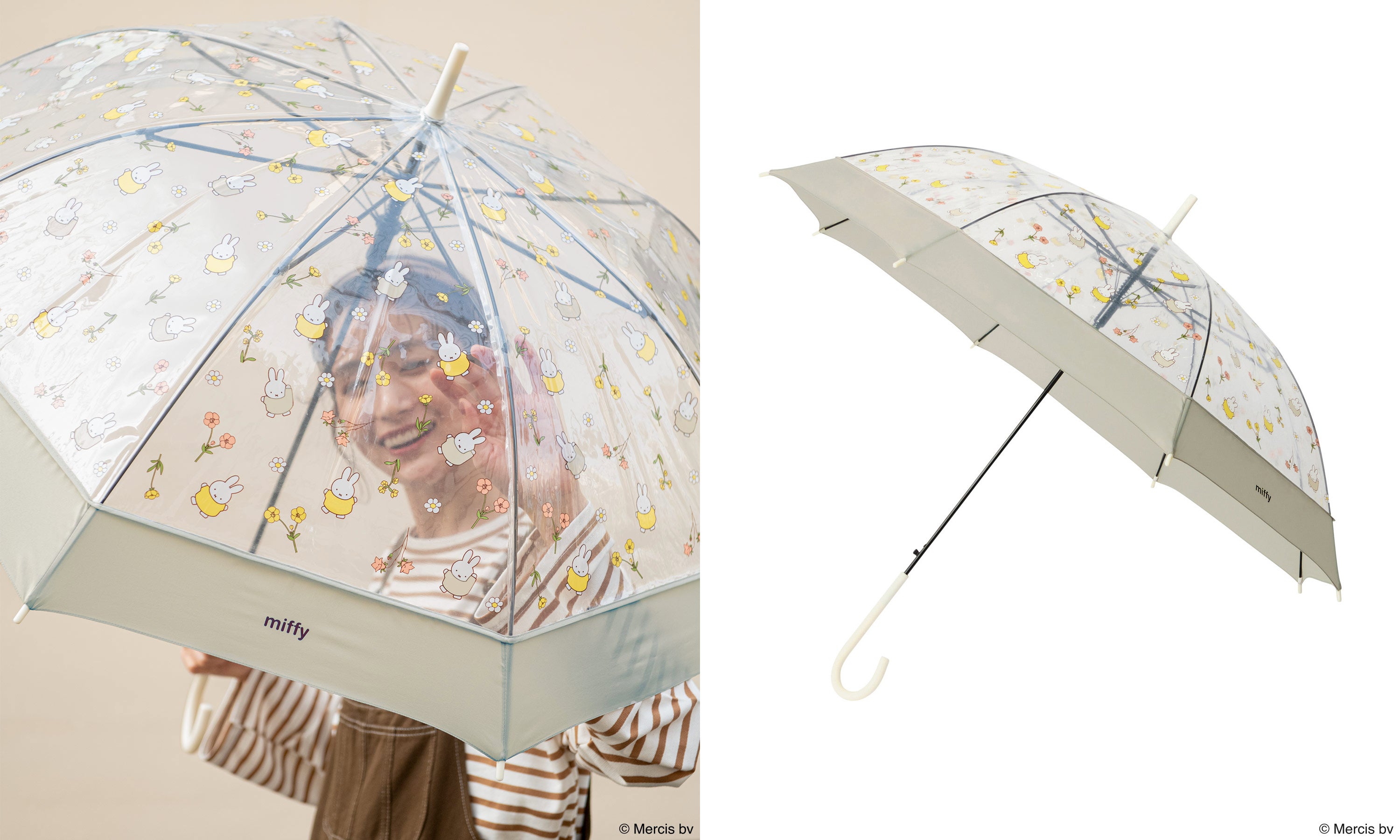 お花畑で遊ぶミッフィーをイメージしたビニール傘。グレーを基調とした落ち着きのあるトーンでまとめ、大人可愛い1本になりました。