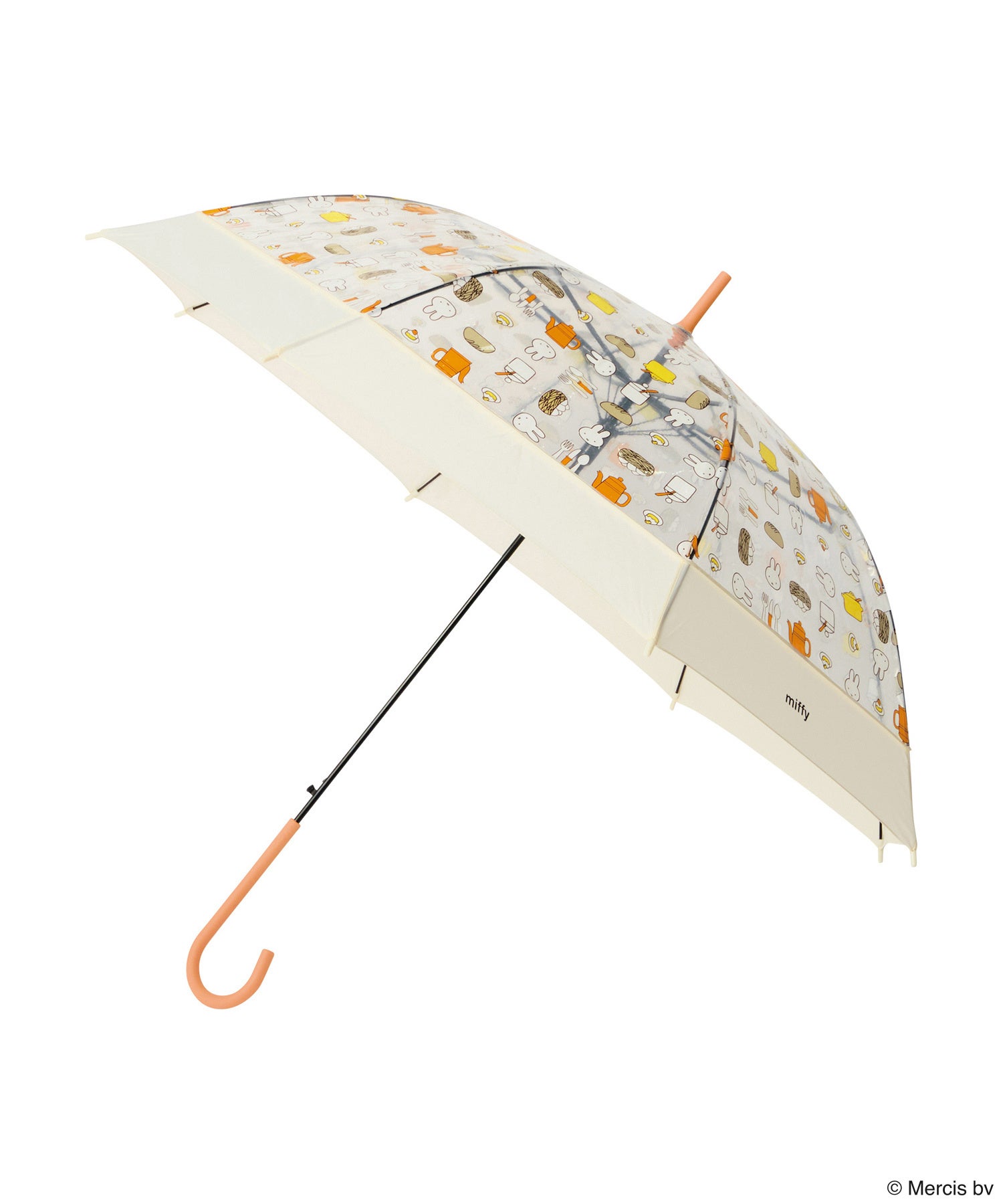 ミッフィーをはじめ、ケーキやポットなど、なんだか楽しくなるような明るいモチーフがいっぱいのビニール傘。オレンジ色の持ち手がミッフィーらしさをさらにアップさせてくれます。