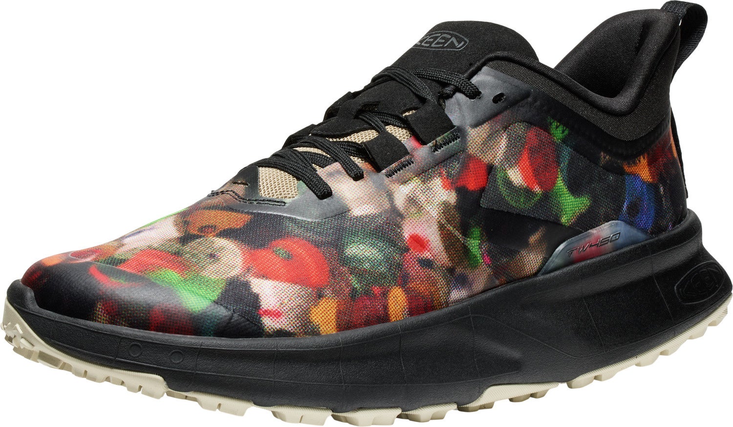 円の動きから着想された転がるような独特の歩⾏感を⽣む、特許出願中のKEEN.CURVEテクノロジーを採⽤、ノンストップの推進⼒を提供⾼い通気性と速乾性に優れるメッシュライニングが、ドライで快適な履き⼼地を提供