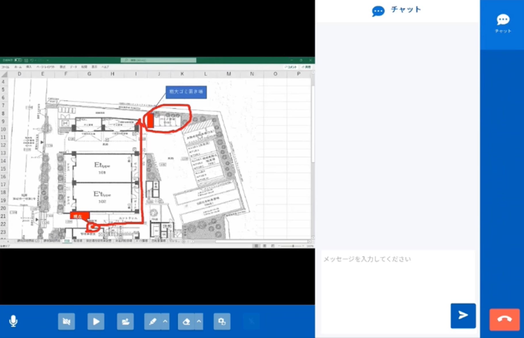 →オペレーターが図面を画面に映し、そこに描画機能を使って線を書き入れながら場所をご案内します。