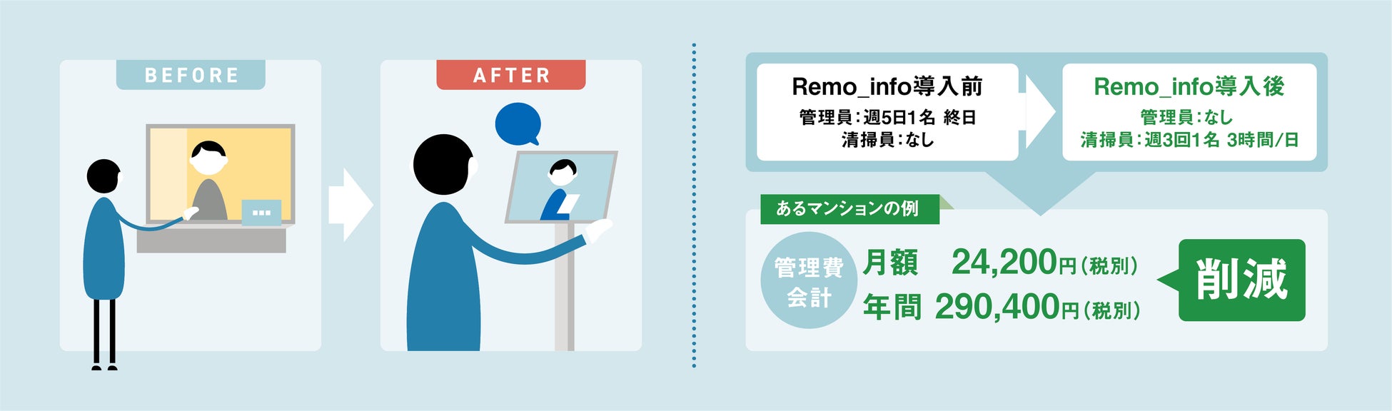 管理員の採用難による管理委託業務費の高騰への対応策として、2024年12月より「Remo_info」を導入しました。仙台市にある約50戸のマンションでは、受付・案内業務の一部に「Remo_info」を導入した場合に年額36万円の管理費削減を見込むことができ、お客様の満足度向上につながるご提案ができました。