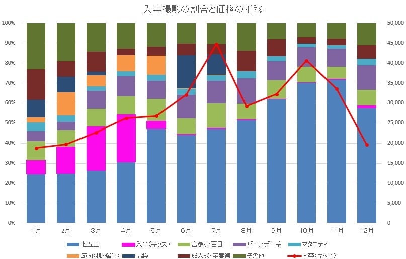入園・入学/卒園・卒業撮影は2月~4月がトップシーズン。スタジオキャラットでも同期間の入卒撮影は年間入卒撮影数の約7割にのぼります。少し早めの1、2月は比較的予約が取りやすいことに加え撮影料金も安価なため、混雑を避けてお得に撮影したい方に多くご利用いただきました。以降5月までは徐々に料金は上昇しますが、引き続き入卒撮影に特化したプランが充実しているため3万円を切る価格で撮影が可能です。