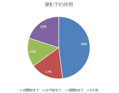 また、入卒撮影の予約時期は2週間前までが最多となりました。特定の日時を希望する場合は1カ月前まで、日時はそれほど拘らずに予約する場合は1週間前までが多いように見受けられます。