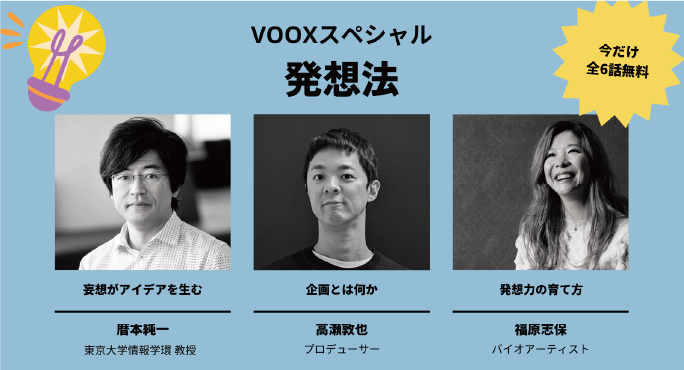 音声教養メディアVOOXの人気3作品を2022年12月23日(金)〜2023年1月6日(金) 無料公開。スワイプ機能の開発者 暦本純一さん、「逃走中」など大人気テレビ番組の企画を手がける プロデューサー 高瀬敦也さん、初音ミクの心臓を再現するプロジェクトなどで注目を集めるバイオアーティスト 福原志保さんの3人が、アイデアの発想について語ります。