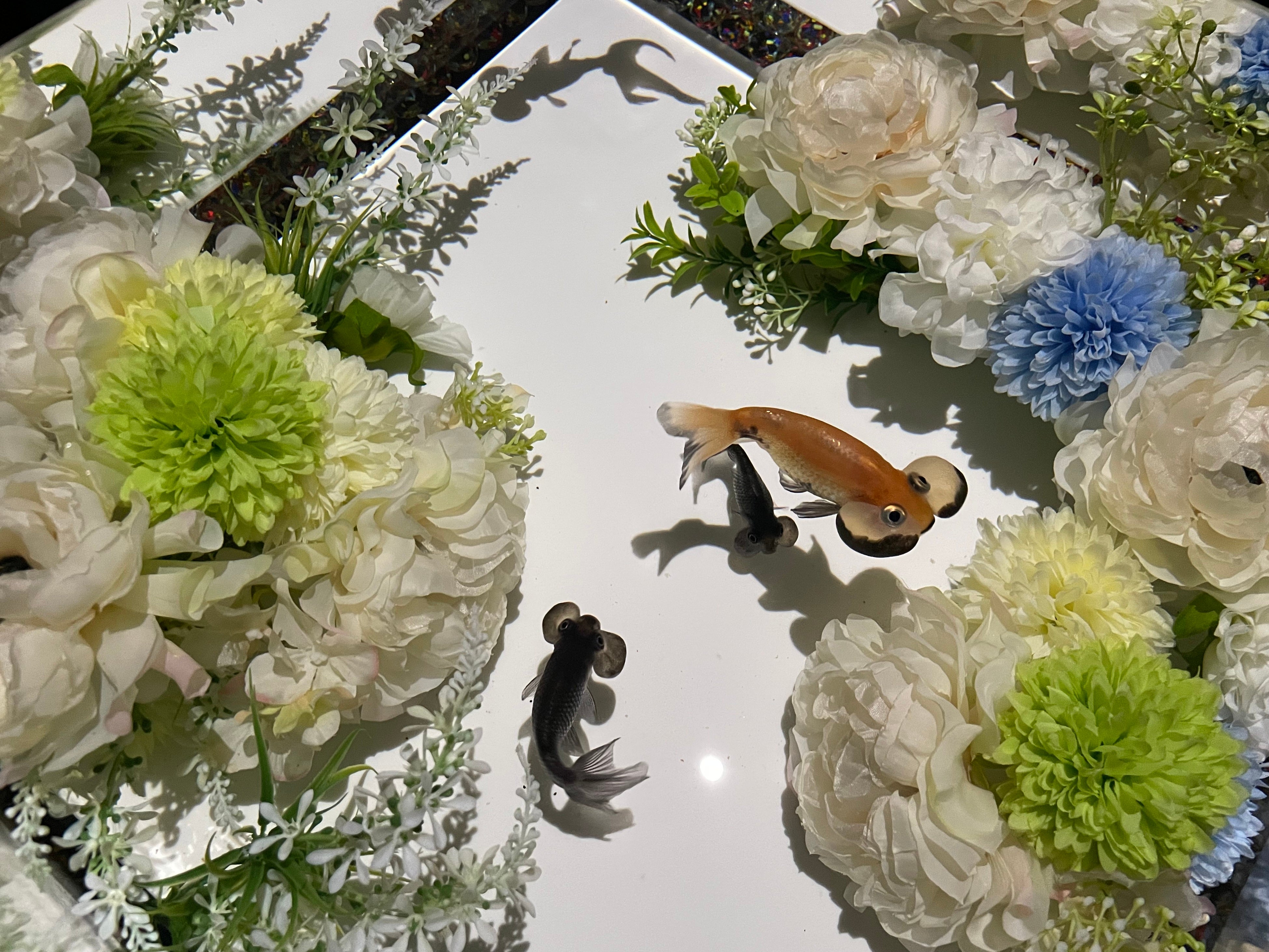 新金魚品評エリアにて、水泡眼が泳ぐ水槽内をホワイトローズが彩る豪華な装飾を施し展示いたします。当館人気NO.1金魚の姿をぜひごゆっくりとご覧ください。