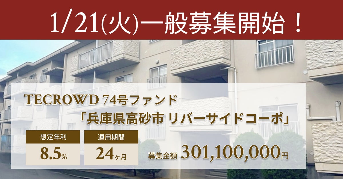 【想定年利8.5%】不動産クラウドファンディング「TECROWD」、国内賃貸型ファンド「兵庫県高砂市 リバーサイドコーポ」を投資対象とするファンド募集開始