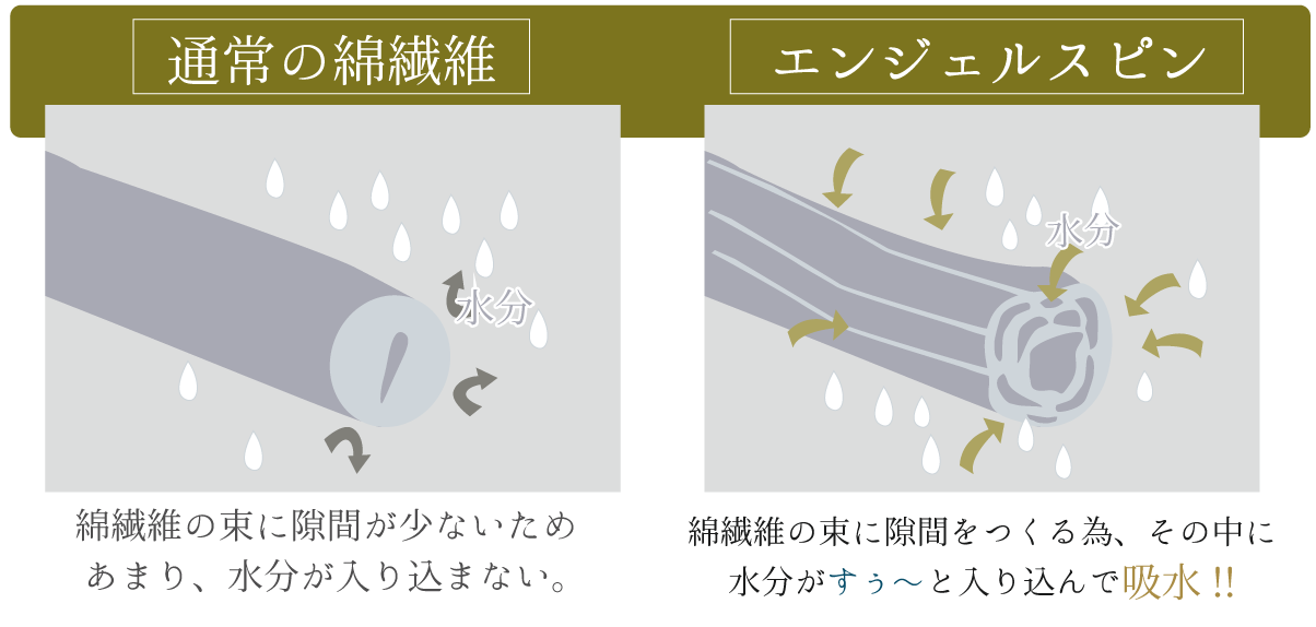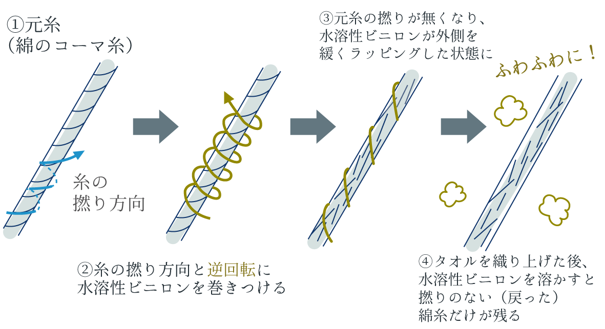 特殊な撚りがかけられていることで、通常の無撚糸と比べても、毛羽落ちが非常に少ない糸です。ふっくらやわらかい風合いなのに毛羽落ちが少ないと洗濯や拭き取る際には大いに使いやすくなりますね。