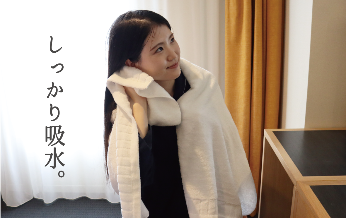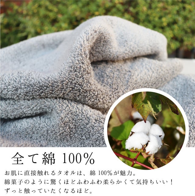 綿100%だからお肌に優しい!ゴシゴシこすらなくてもサッと吸水。敏感な肌やキューティクルが柔らかくなった髪もやさしく拭きあげます。
