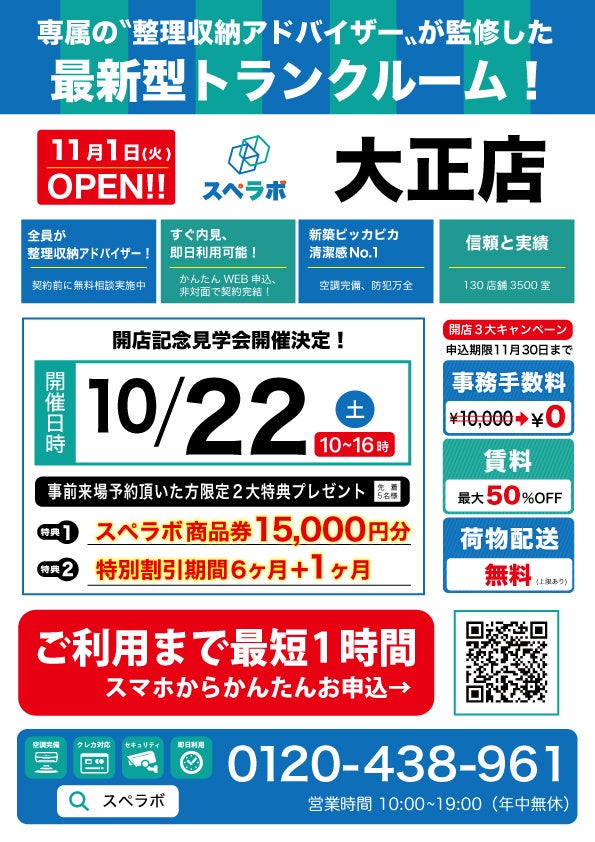 【11月1日(火)オープン】見学から契約、解約まで完全非接触・非対面、お申し込みからご利用まで最短1時間!都内、大阪などにて絶賛運営中のトランクルーム【スペラボ】が大阪市大正駅近くに出店!
