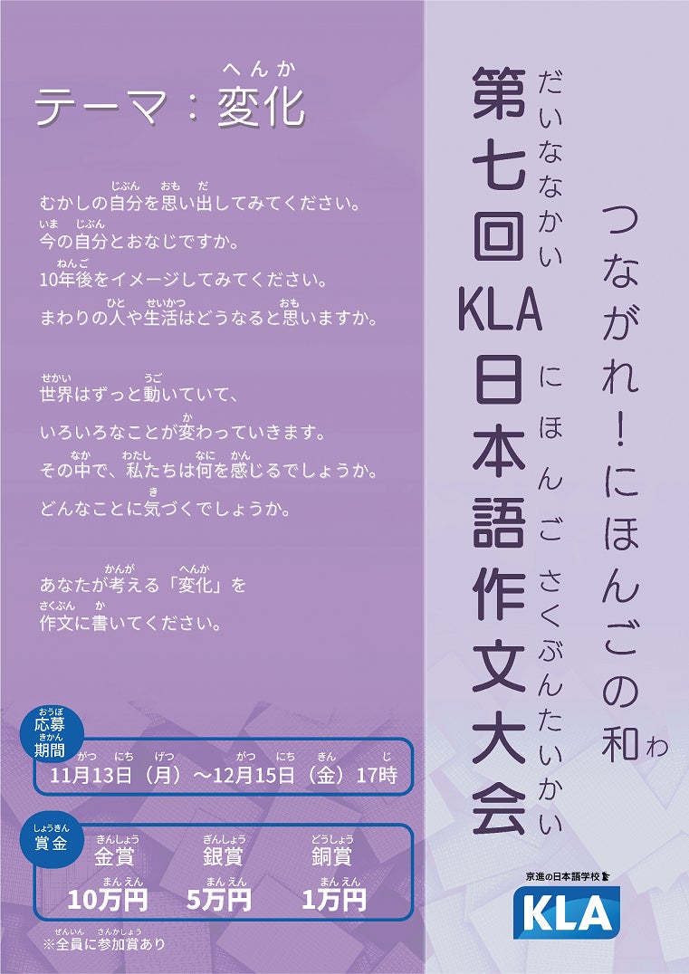 今回のテーマは「変化」。コロナ禍前後の社会情勢、様々な問題が山積する国際情勢、金融問題など、昨今は変化の著しい時代にあります。それぞれの夢や目標に向かって日本語学習に取り組む留学生たちには、どんな「変化」があり、それをどう綴るのでしょうか。作品は「初級の部」は300~600字、「中上級の部」は800~1,600字の2部門で募集。大多数が日本の大学や大学院、専門学校への進学を目指しているKLAの留学生は、入試で小論文記述力を問われることも多く、「大会で日本語の作文をしたことが、入試で役に立った」という声も毎年多く出ています。