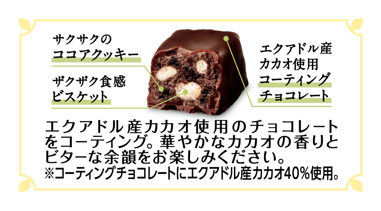 本商品はカカオのおいしさにこだわり、厳選した「華やかな香りとビターな余韻が特長のエクアドル産カカオ※」のチョコレートを使用し、チョコ好きの方もご満足いただける、すっきりとした本格ビターな味わいに仕上げました。またパッケージからも【こだわりカカオ】のおいしさや特別感をお伝えするために、カカオの産地をイメージしたイラストを採用しています。