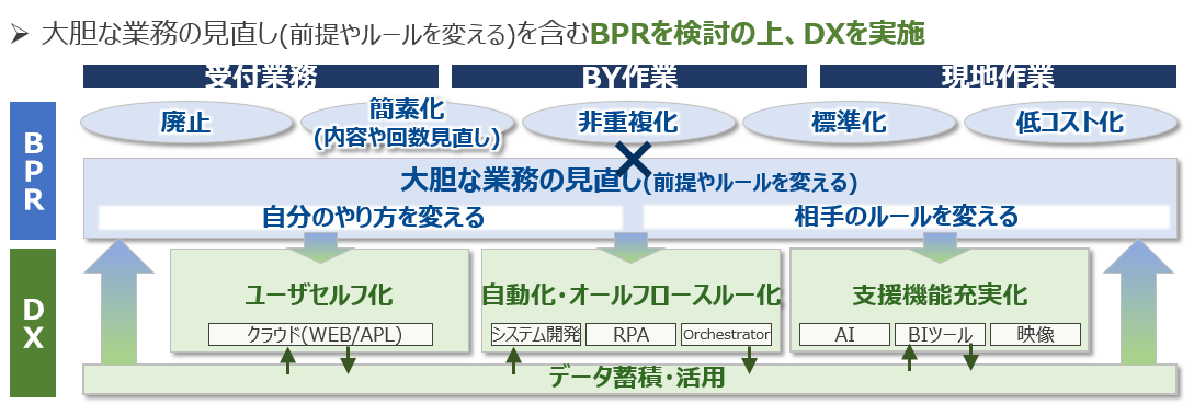 昨今、事業運営に必要な業務システム・ツールをローコード開発<*2>により内製化できるクラウドサービスや業務をデジタル化するサービス等が多種提供され始めています。NTT東日本における業務運用についても、生産性向上やリモートワークを中心とした新たな働き方を見据え、業務のBPR・DXを推進しており、自動化や新たな仕組みを導入検討・トライアル・本格運用しています。