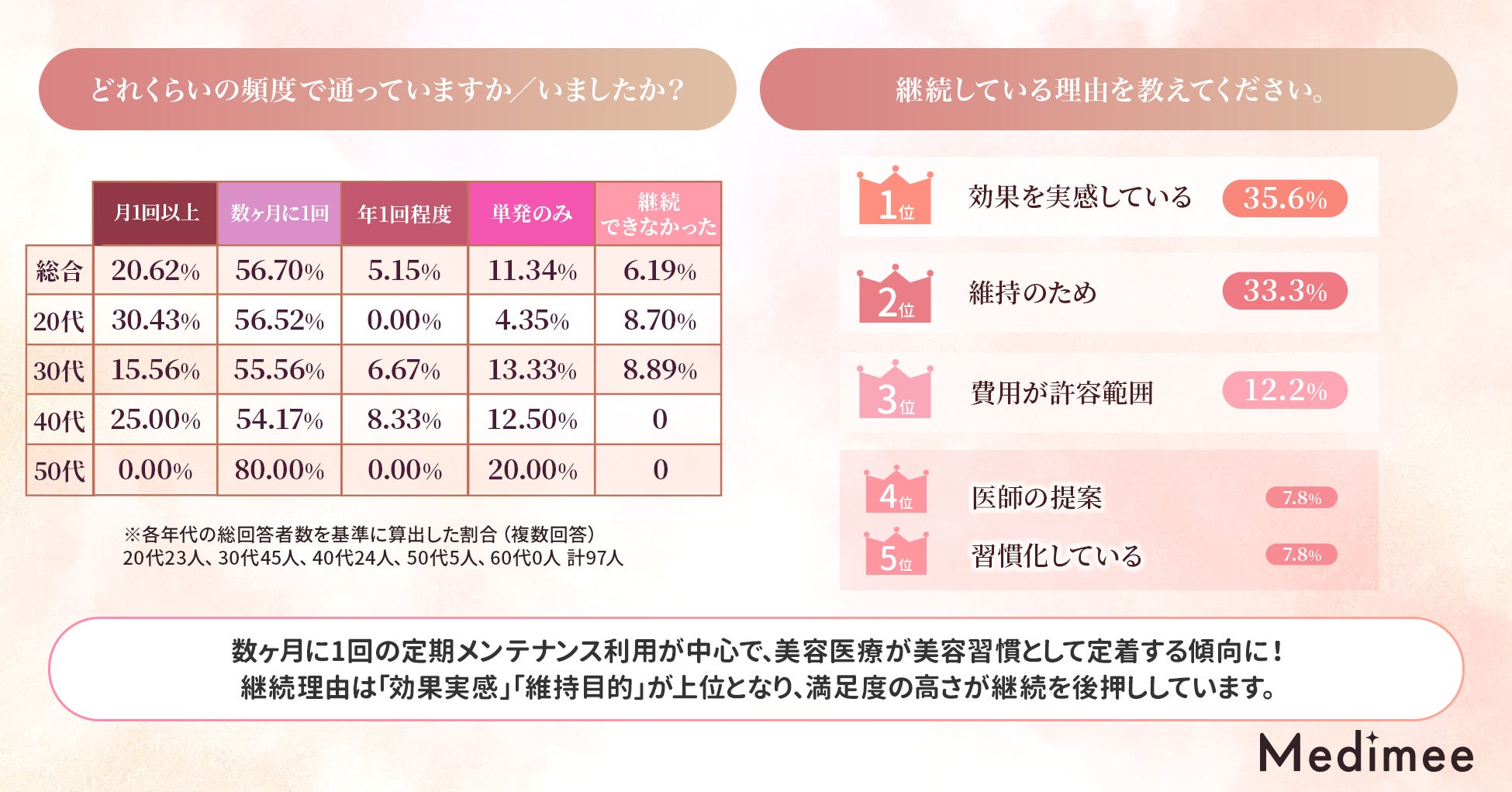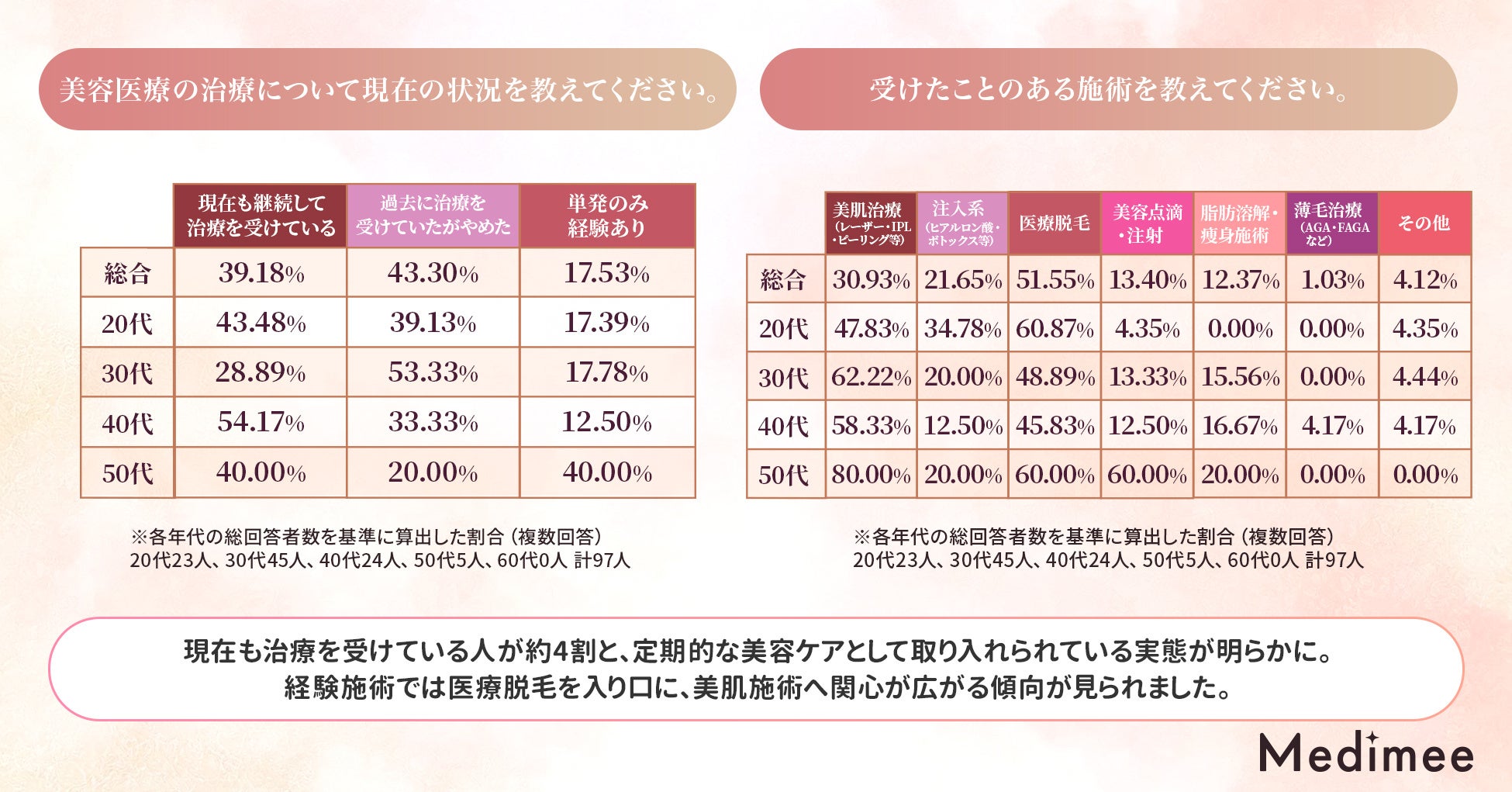 そこでMedimeeでは、20代〜50代の美容医療経験者の女性を対象に、美容医療の継続率や通院頻度、やめた理由、費用感、さらに継続しやすくなる仕組みについて調査を実施しました。