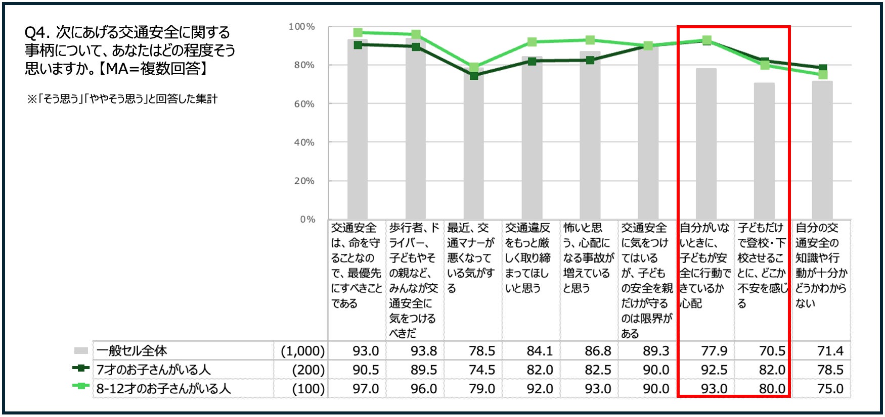 特に、小学生の子どもを持つ親の多くが、「自分がいないときに、子どもが安全に行動できているか不安(約9割)」「子どもだけで登下校させることにどこか不安を感じる(約8割)」といった思いを抱く、結果となりました。