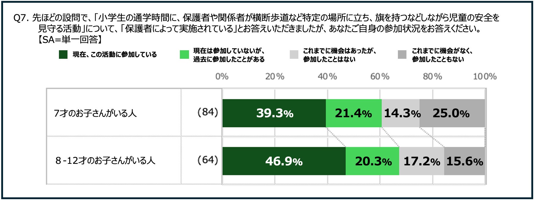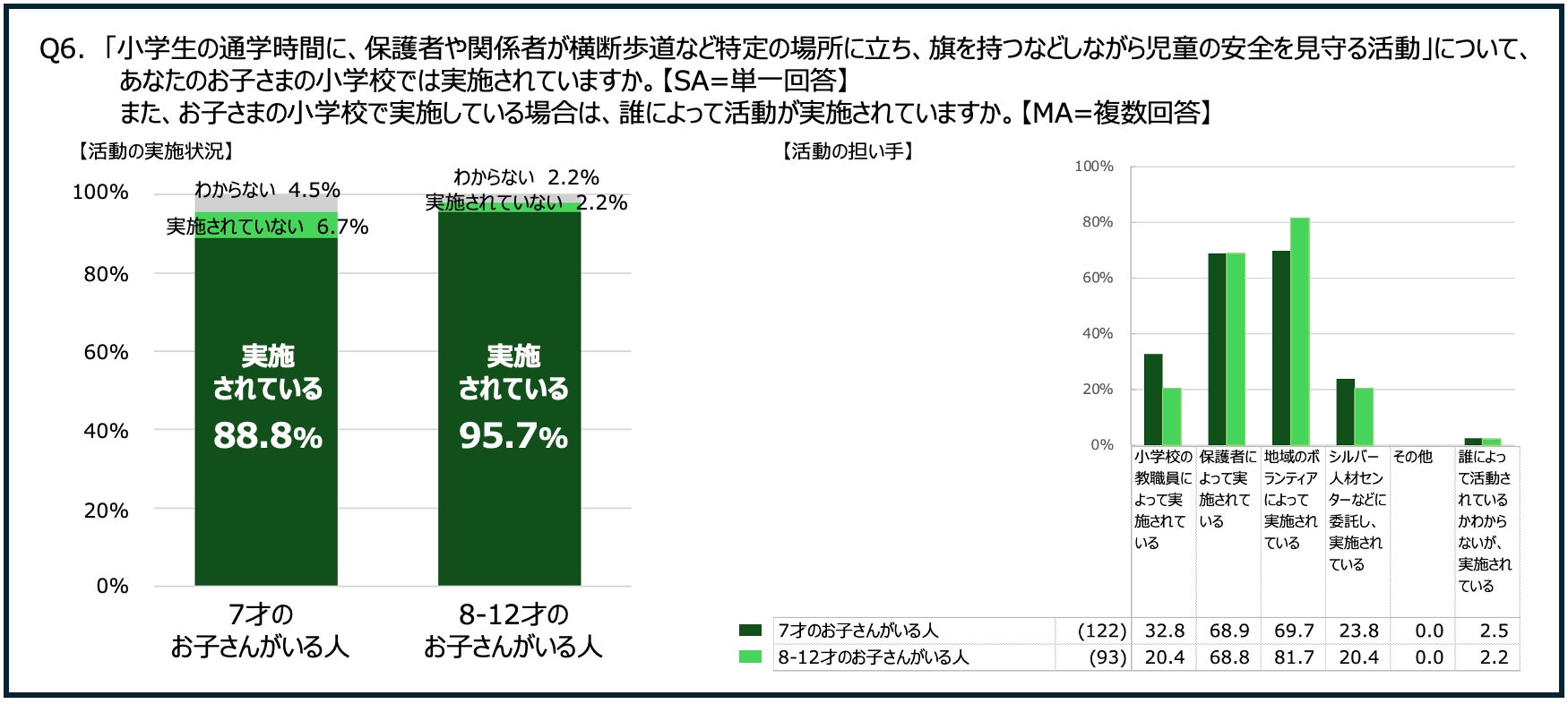 実際に、「見守り活動が実施されている」と答えた7才のお子さんがいる人は88.8%、8-12才ののお子さんがいる人は95.7%と、ほとんどの学校で「こども見守り活動」が実施されていることがわかりました。その実施者については、保護者や地域のボランティアが活動を行うケースが約6割以上という結果となりました。