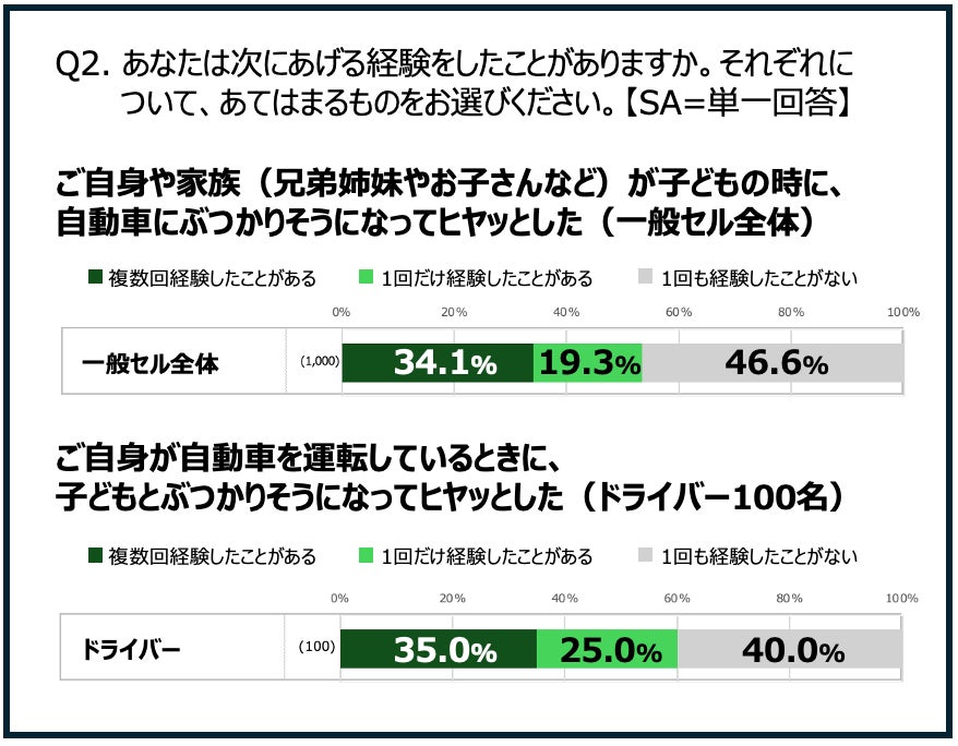 53.4%が「自身や家族(兄弟姉妹やお子さんなど)が子どもの時に、自動車にぶつかりそうになってヒヤッとした」と回答。また、ドライバー100名の60.0%が「子どもとぶつかりそうになってヒヤッとした経験がある」と回答しており、リスクが“身近なもの”として存在する実態が浮かび上がりました。