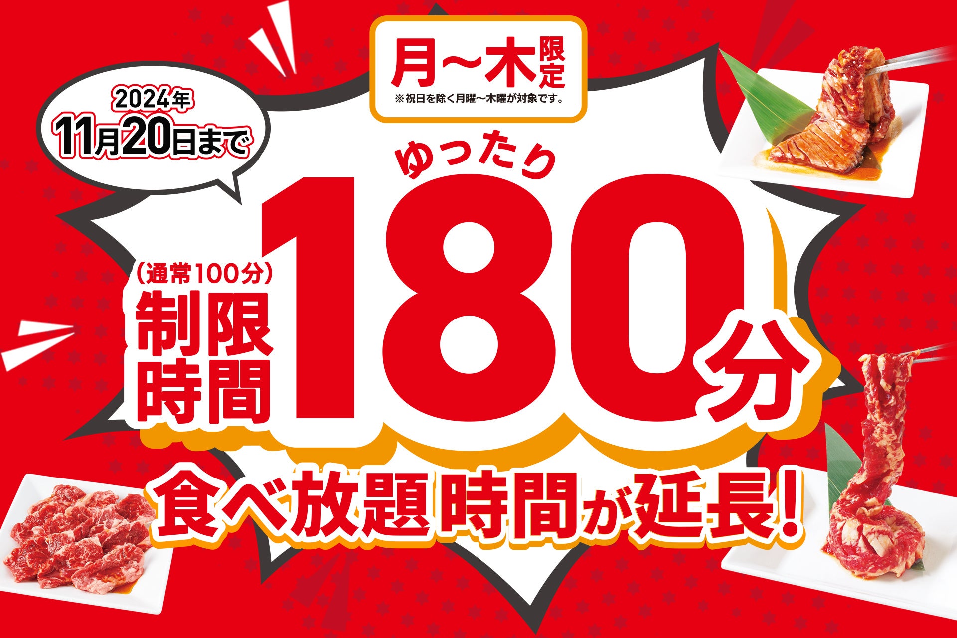 じゅうじゅうカルビでは、2024年11月20日(水)まで、月~木曜日限定で食べ放題コースの時間延長(通常100分のところ180分)を実施しております。※和光新倉店は除く