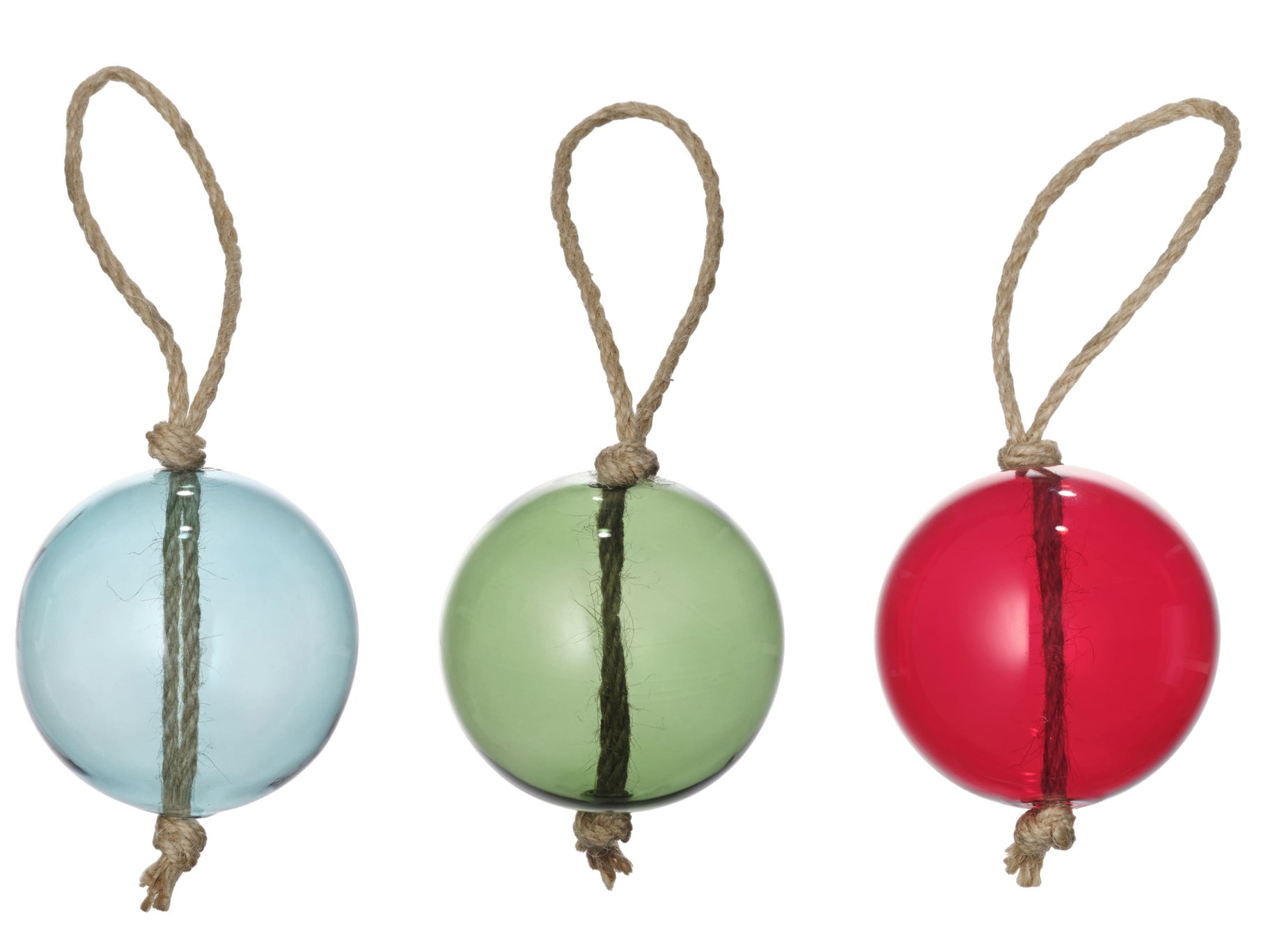 色違いのデコレーション3点セットは、グラスのボールオーナメントの内側にジュートのひもが通っています。
