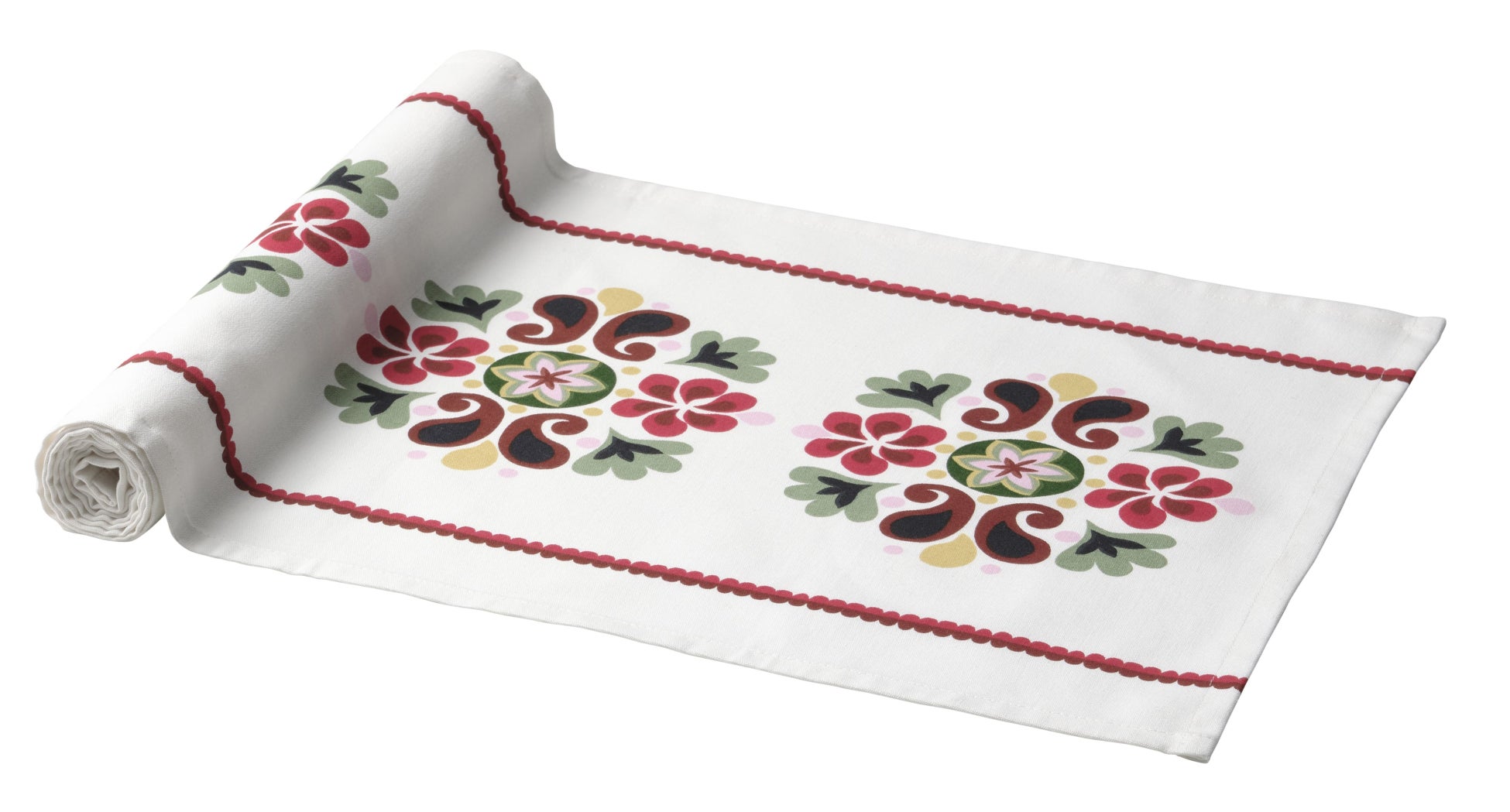 オシャレなテーブルランナーを敷くだけで、あっという間にダイニングテーブルがエレガントな印象になります。中央にカービッツ(草花模様)をインスピレーションにした模様をあしらったクリスマスにぴったりのパターンです。