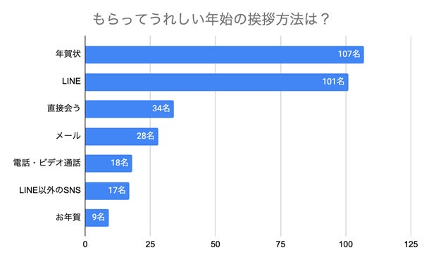 一方「もらってうれしい年始の挨拶方法は?」との問いには、「年賀状」が最も多く107名、次いで「LINE」が101名、「直接会う」が34名でした。