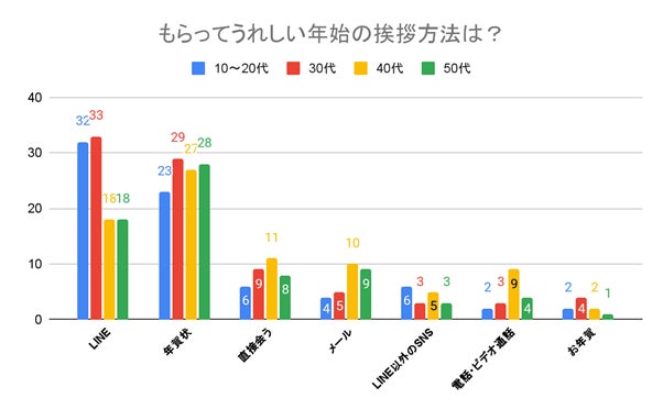 世代別の結果を見ると、10代〜20代ではLINEが最も喜ばれる一方、40代以上では年賀状への評価が高い傾向にあります。