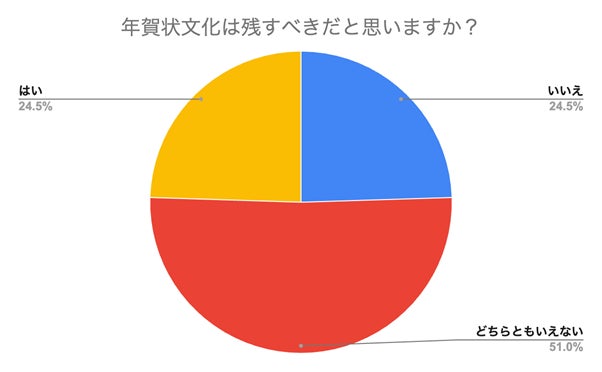 しかし「年賀状文化は残すべきだと思いますか?」という問いには「どちらともいえない」が51%と最多で、「はい(残すべき)」「いいえ(残すべきではない)」がそれぞれ24.5%と意見が分かれる結果に。