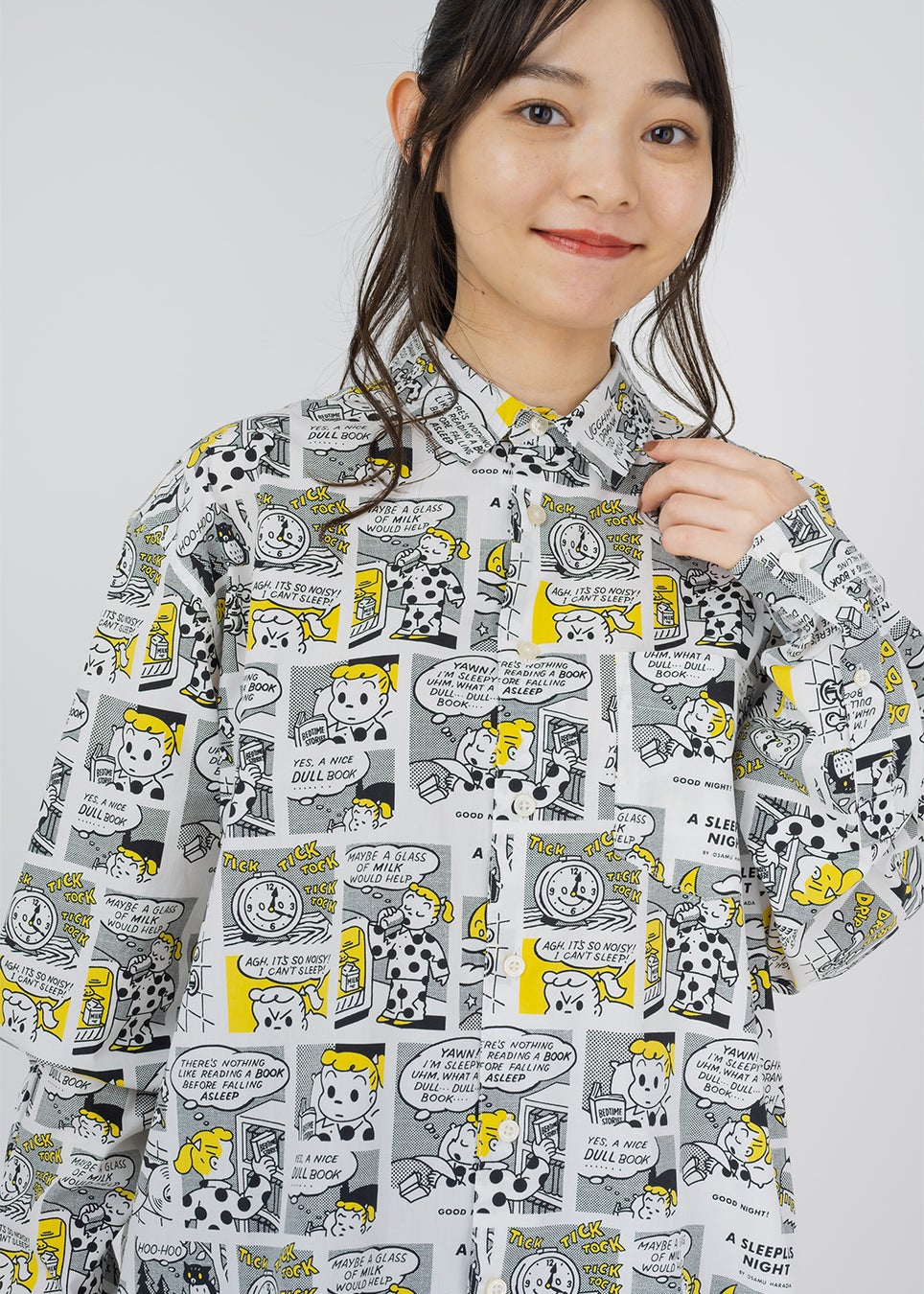 ラインアートで描かれたキュートなジャックとジル。バック裾にはキャットとドッグ、さらに袖にはハンプティ・ダンプティをプリント。