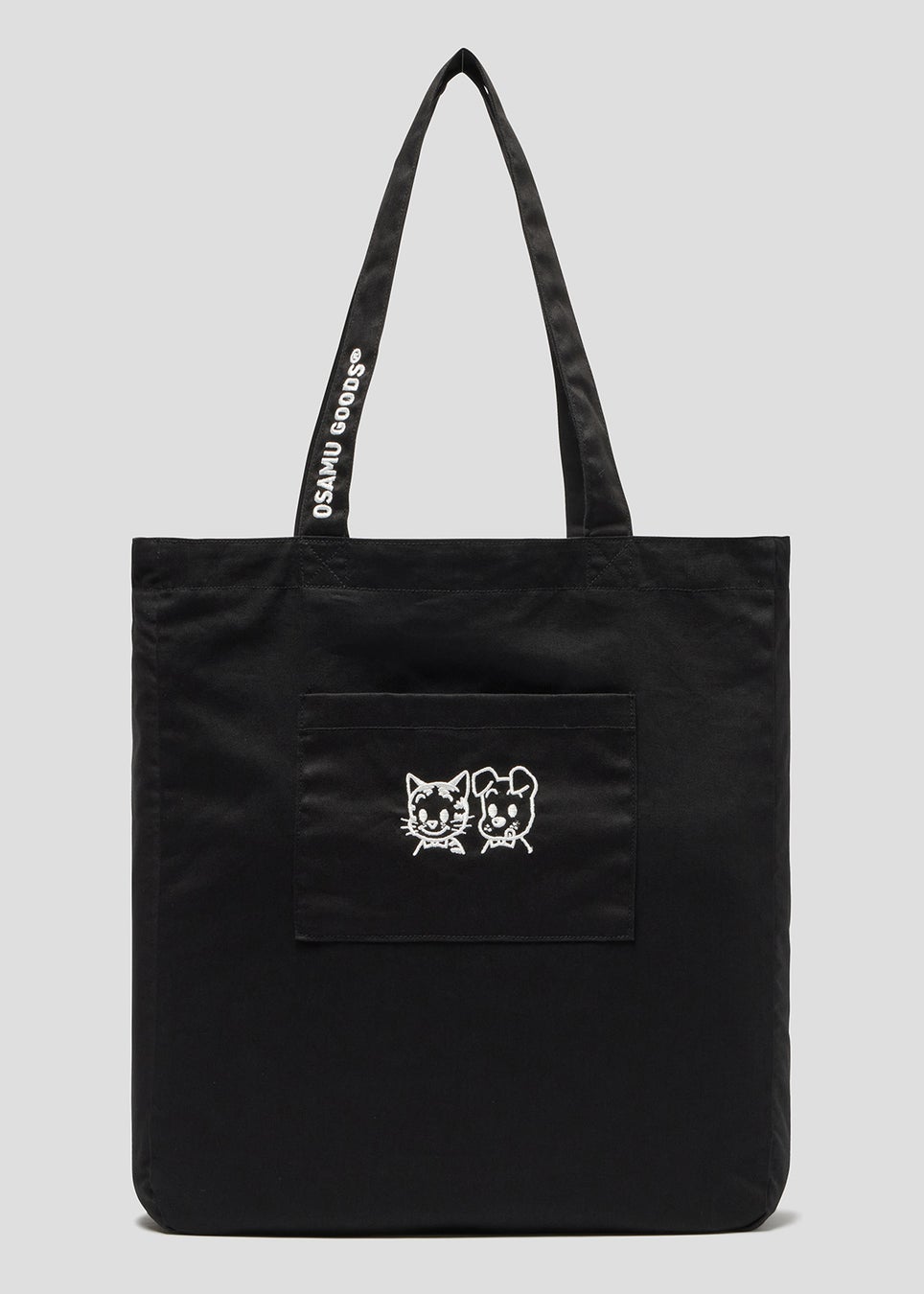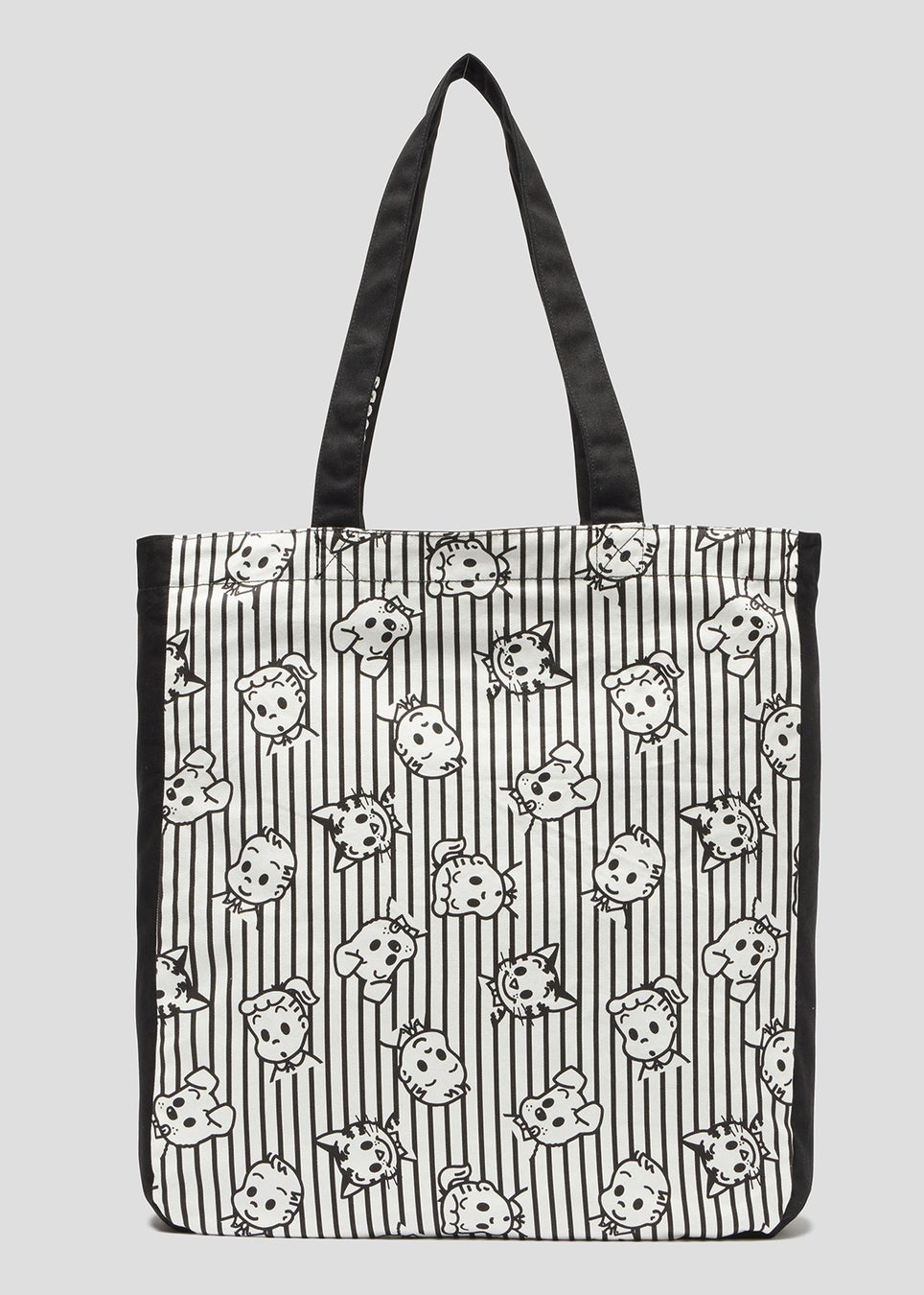 ジャック、ジル、キャット、ドッグがストライプの上に並んだパターン柄と、キャットとドッグがポケットに刺繍されたシンプルデザインとの、リバーシブル仕様のトートバッグです。
