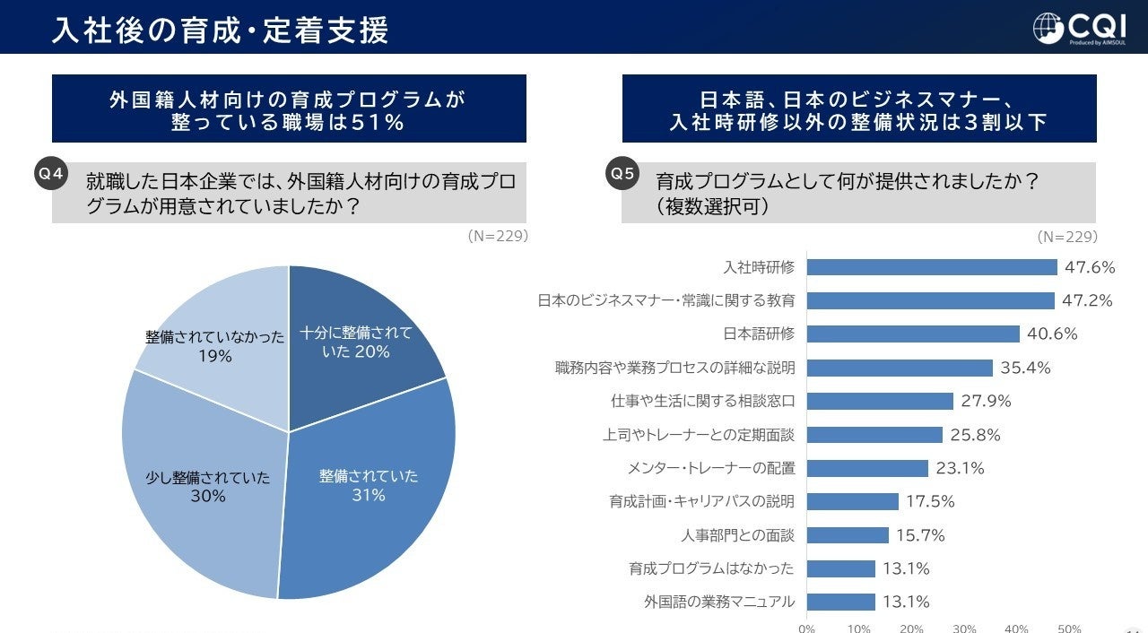「外国籍人材向けの育成プログラムが用意されていたか」という質問に対し、49%の回答者が「少し整備されていた」「整備されていなかった」と回答。育成プログラムの内容に関しては「入社時研修」「日本のビジネスマナー・常識に関する教育」が上位に挙がりました。