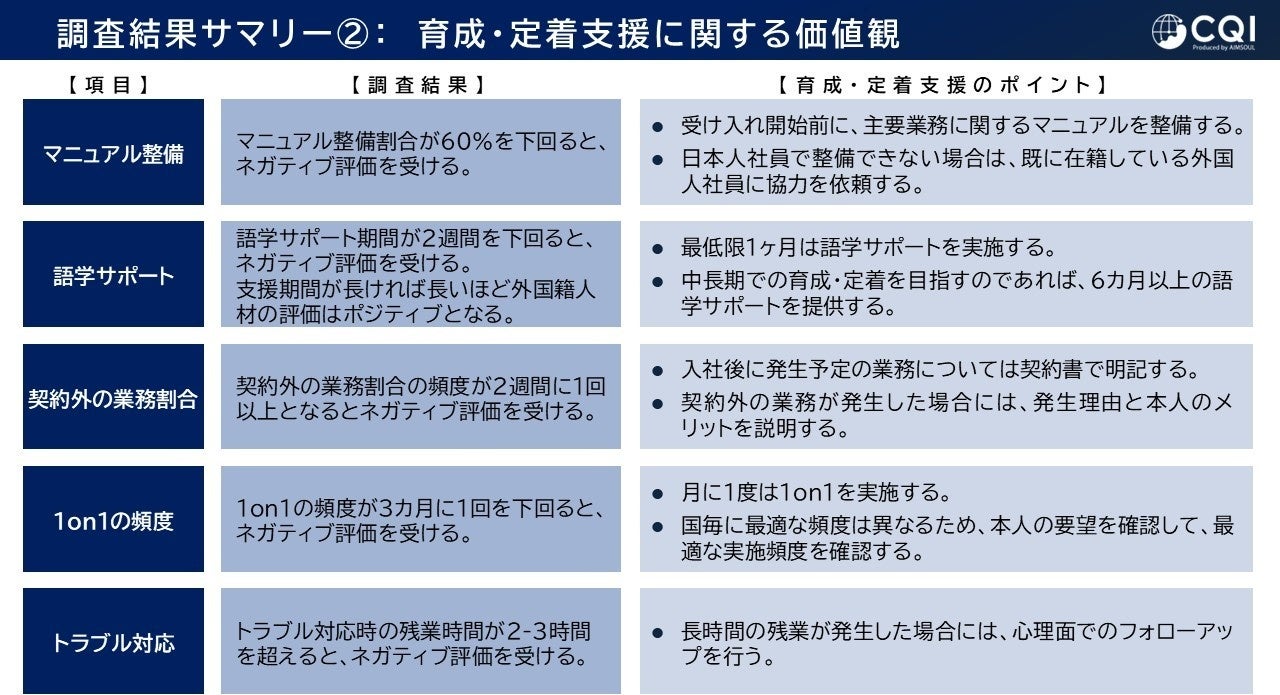 株式会社エイムソウル(本社:東京都台東区、代表取締役:稲垣隆司)は、14社のパートナー企業と共同調査を実施し、結果を取りまとめました。外国籍人材の育成・定着支援の実態や、各国の育成・定着支援に対する価値観を調査・分析しましたので、一部抜粋して発表いたします。日本で働く外国籍人材が戸惑う要因を把握し、職場の外国籍人材に対するマネジメントや、外国籍人材への育成にお役立ていただきたいと考えております。