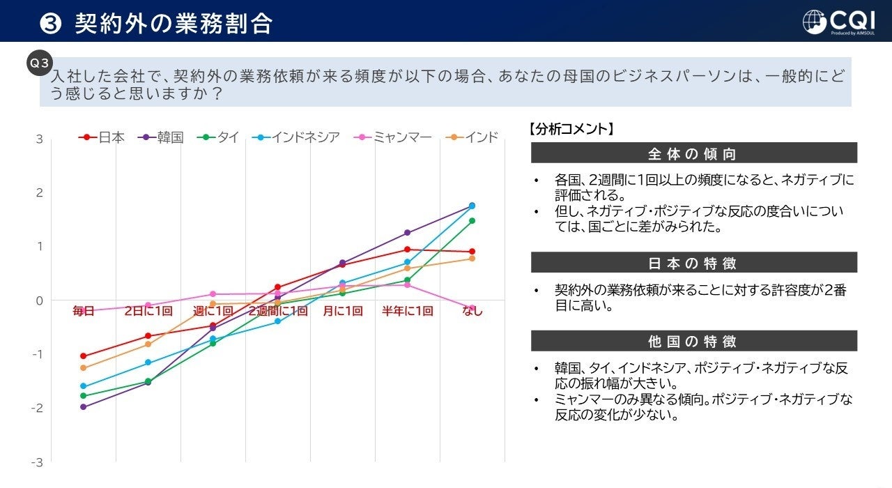 「契約外の業務依頼が来る頻度」に対する母国のビジネスパーソンの印象を調査したところ、各国で2週間に1回以上の頻度になると、ネガティブに評価されることが明らかに。ただし、ネガティブ・ポジティブな反応の度合いについては、国ごとに差が見られました。