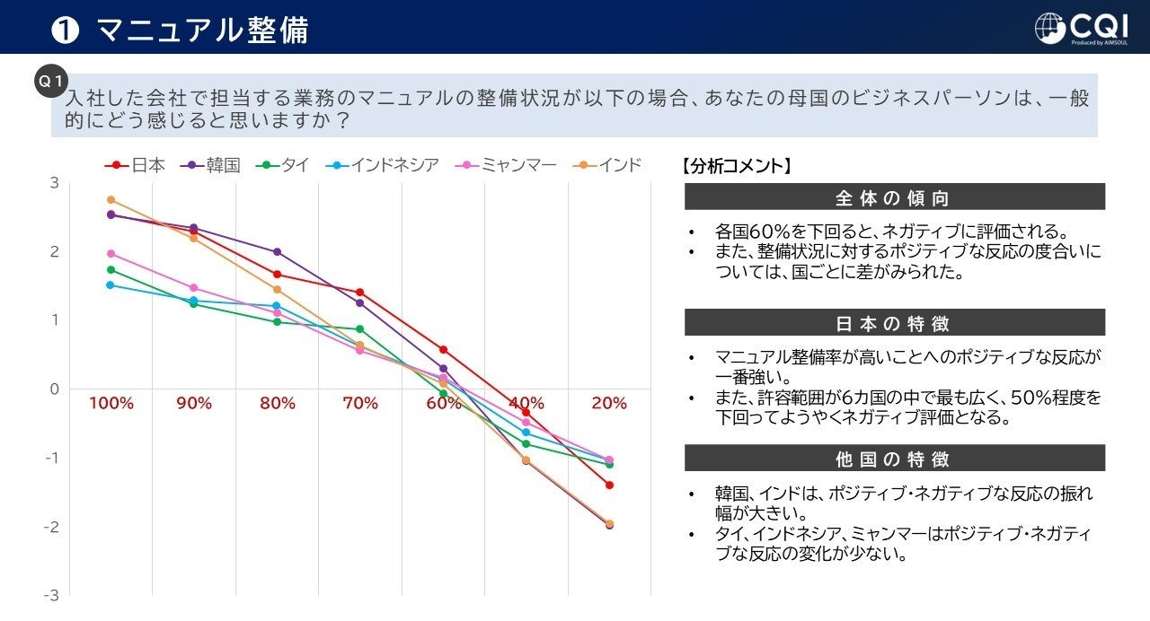 担当する業務の「マニュアル整備状況」に対する母国のビジネスパーソンの印象を調査したところ、各国で60%を下回ると、ネガティブに評価されることが分かりました。また、整備状況に対するポジティブな反応の度合いについては、国ごとに差が見られました。