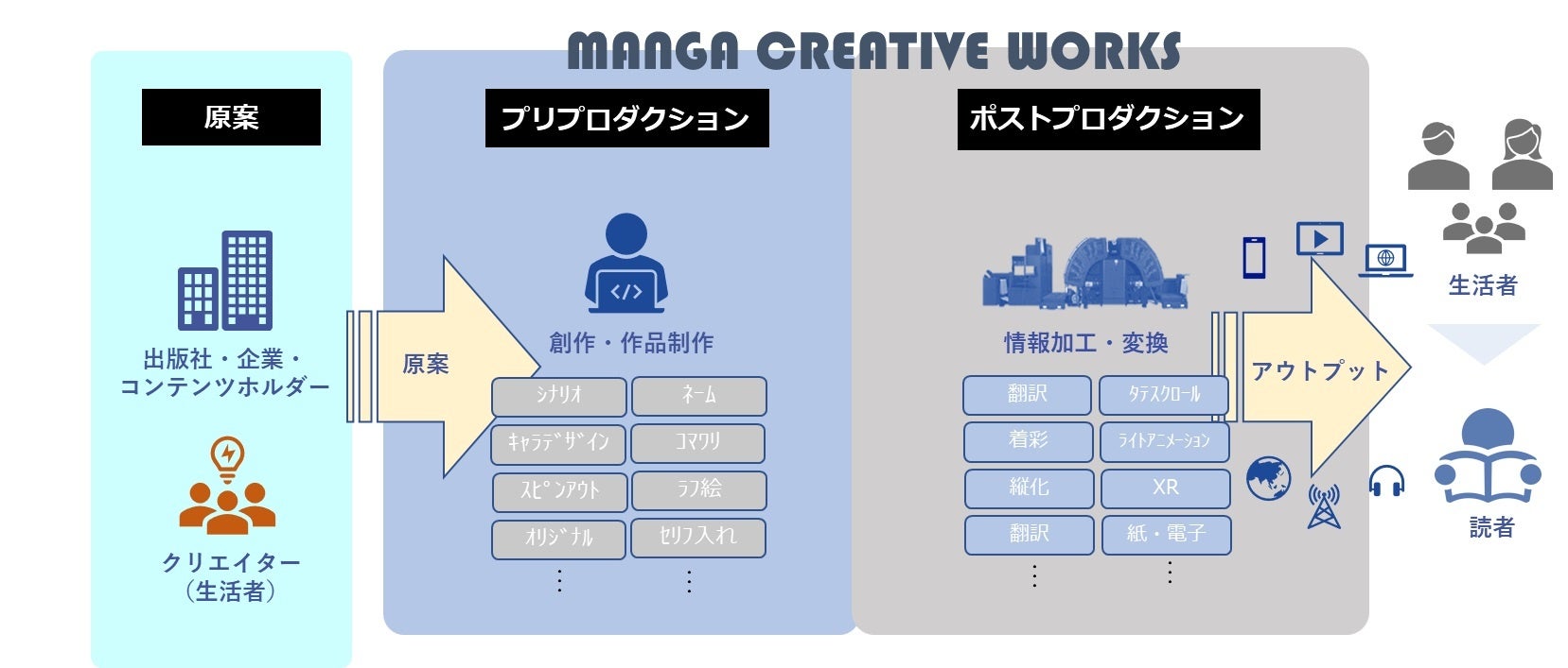 この体制は、小説等のコミカライズ、電子書籍の制作、縦スクロールマンガへの変換・制作、着彩(カラー化)、多言語翻訳、動画・音声の作成など、コミックを中心とした多様なコンテンツづくりを支える新しい体制です。