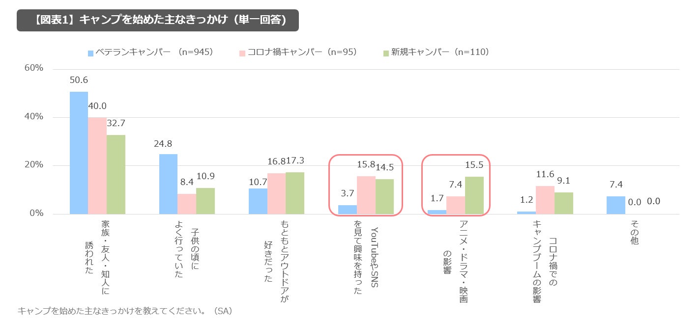 「家族・友人の誘い」に加え、「SNS」や「エンタメ作品」がキャンプを始めたきっかけ