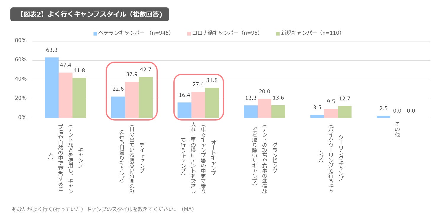 ベテランキャンパーには「野営」、コロナ禍・新規キャンパーには「デイキャンプ」や「オートキャンプ」が人気