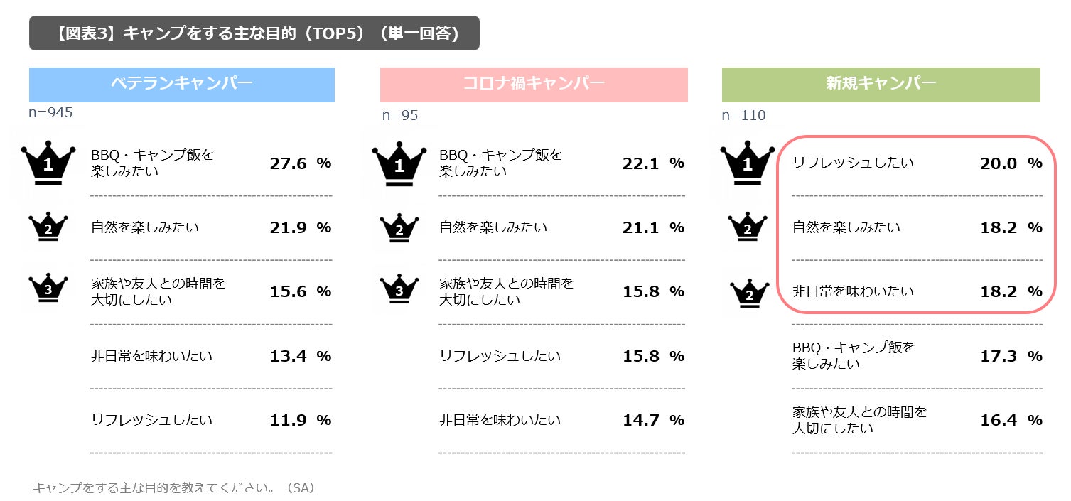 「食」重視のベテラン・コロナ禍キャンパー、「リフレッシュ」や「非日常体験」重視の新規キャンパー
