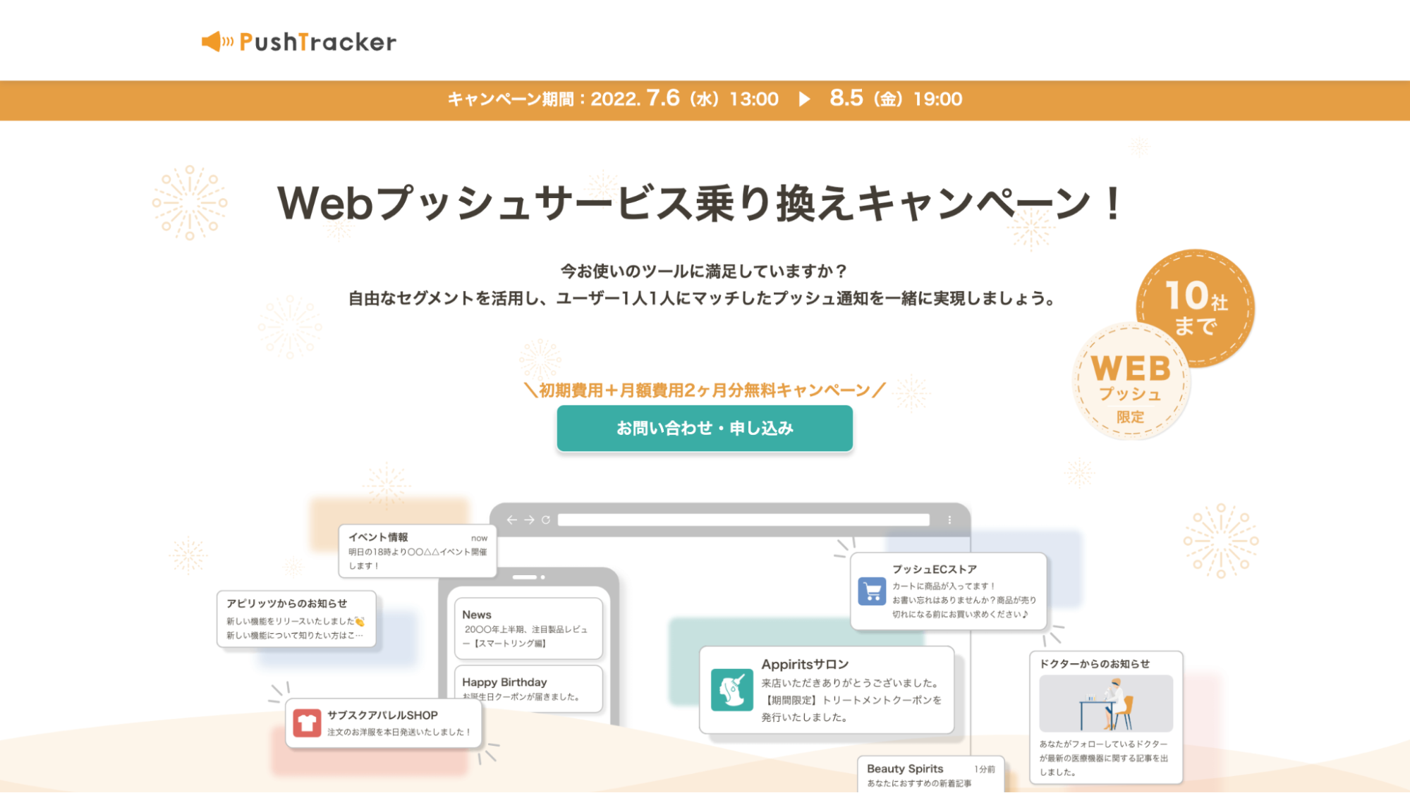 顧客体験型プッシュ配信・CRMツール「PushTracker」が、Webプッシュ通知の無料乗り換えキャンペーンを開始。初期費用と2ヶ月間の月額費用を0円とし、お客様のデータ活用およびコスト最適化を支援