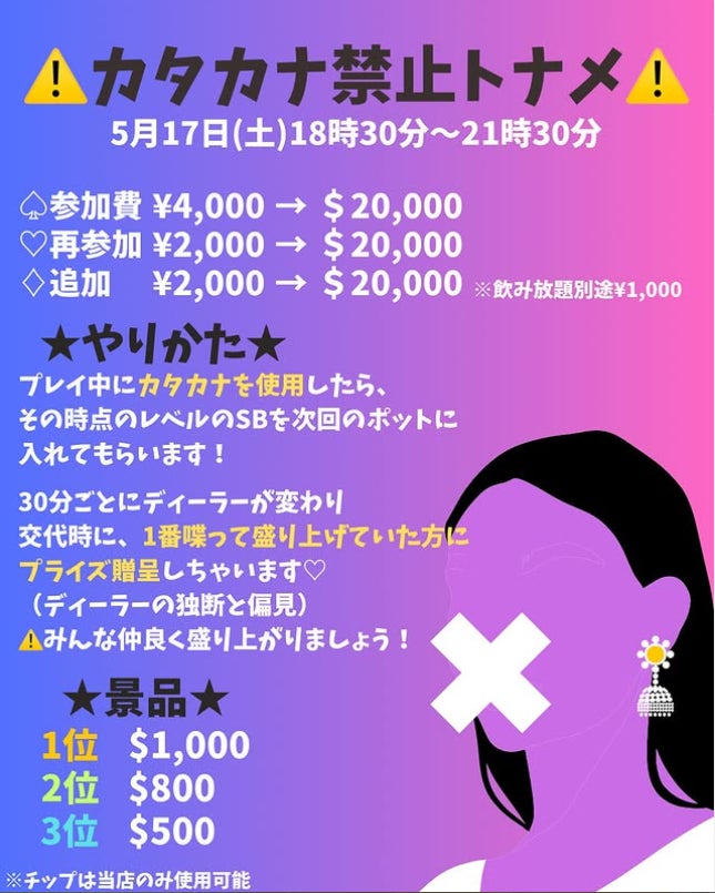 株式会社そらが運営するアミューズメントカジノ『 CASINO BLOW 恵比寿店 』にて、5月17日(土)ユニークなルールに注目 “ カタカナ禁止 ” ポーカートーナメントを開催いたします。