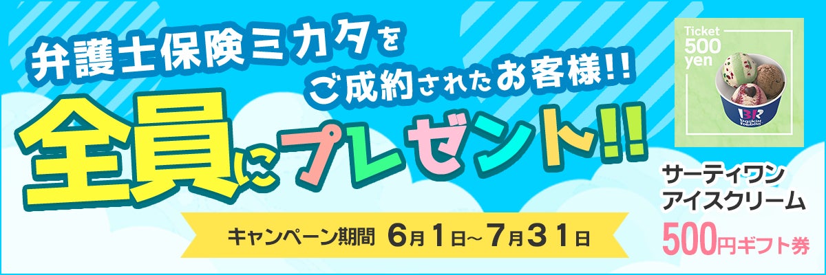 「弁護士保険ミカタ」ご成約で「サーティワン アイスクリーム 500円ギフト券」もれなくプレゼント【弁護士保険ステーション】