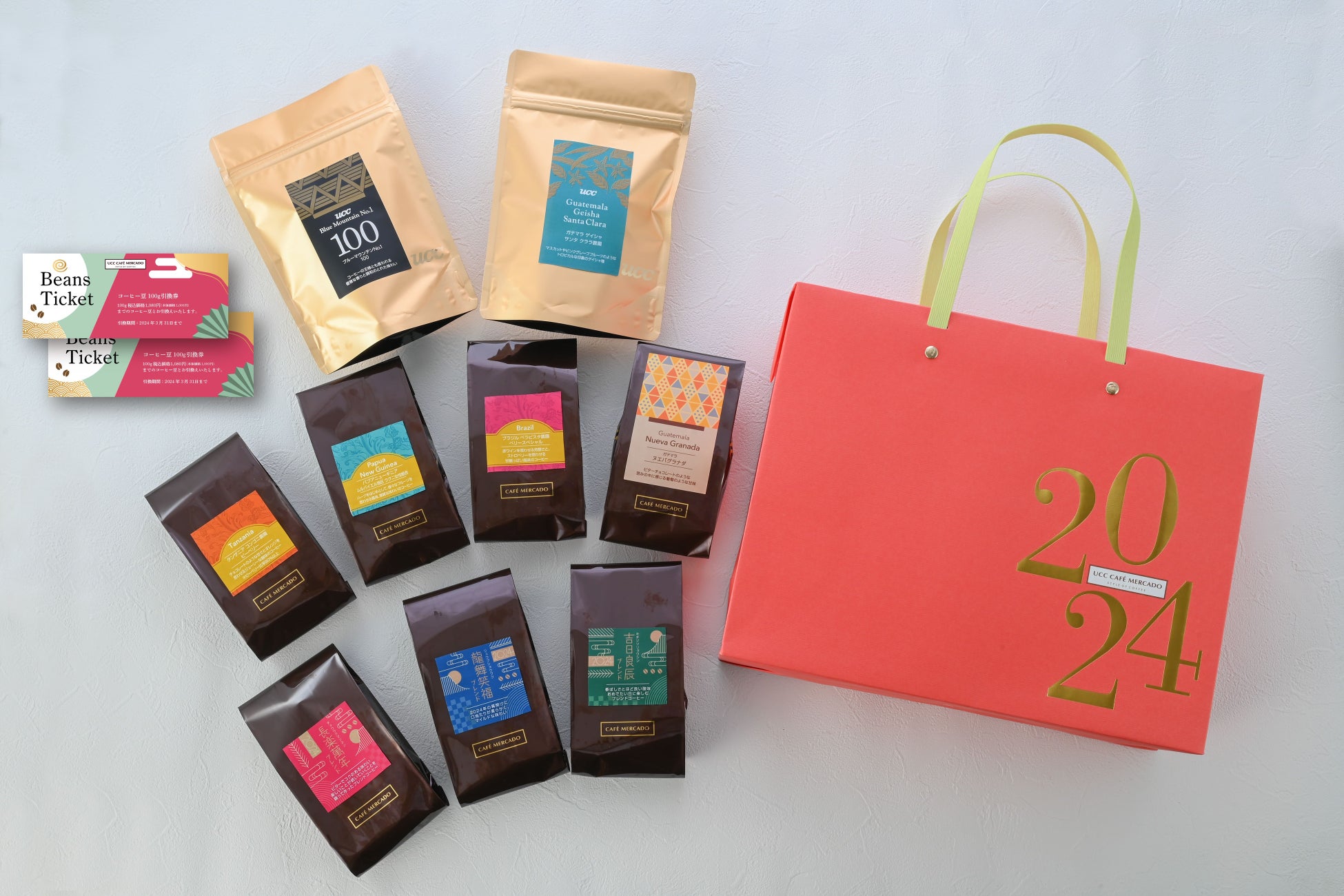 UCCが直営で展開するコーヒー豆挽き売り業態「UCCカフェメルカード」「カフェノバール」では、世界各地のコーヒー豆を取り揃えています。新しい年を迎える皆様がコーヒーとともに豊かな時間を過ごせますように、という気持ちを込めて、各店舗にて数量限定で、福袋限定ブレンドやスペシャルティコーヒーなどをセットにした福袋『2024年珈琲福袋』をお届けします。