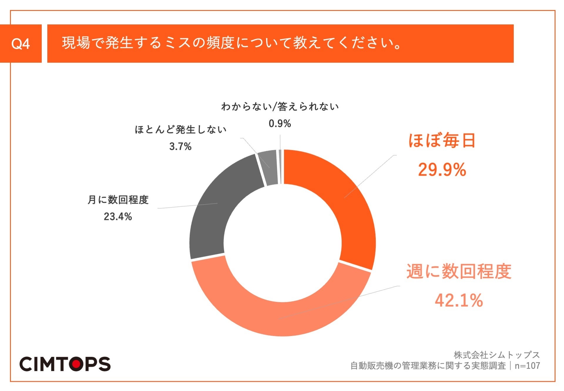「Q4.現場で発生するミスの頻度について教えてください。」(n=107)と質問したところ、「ほぼ毎日」が29.9%、「週に数回程度」が42.1%という回答となりました。