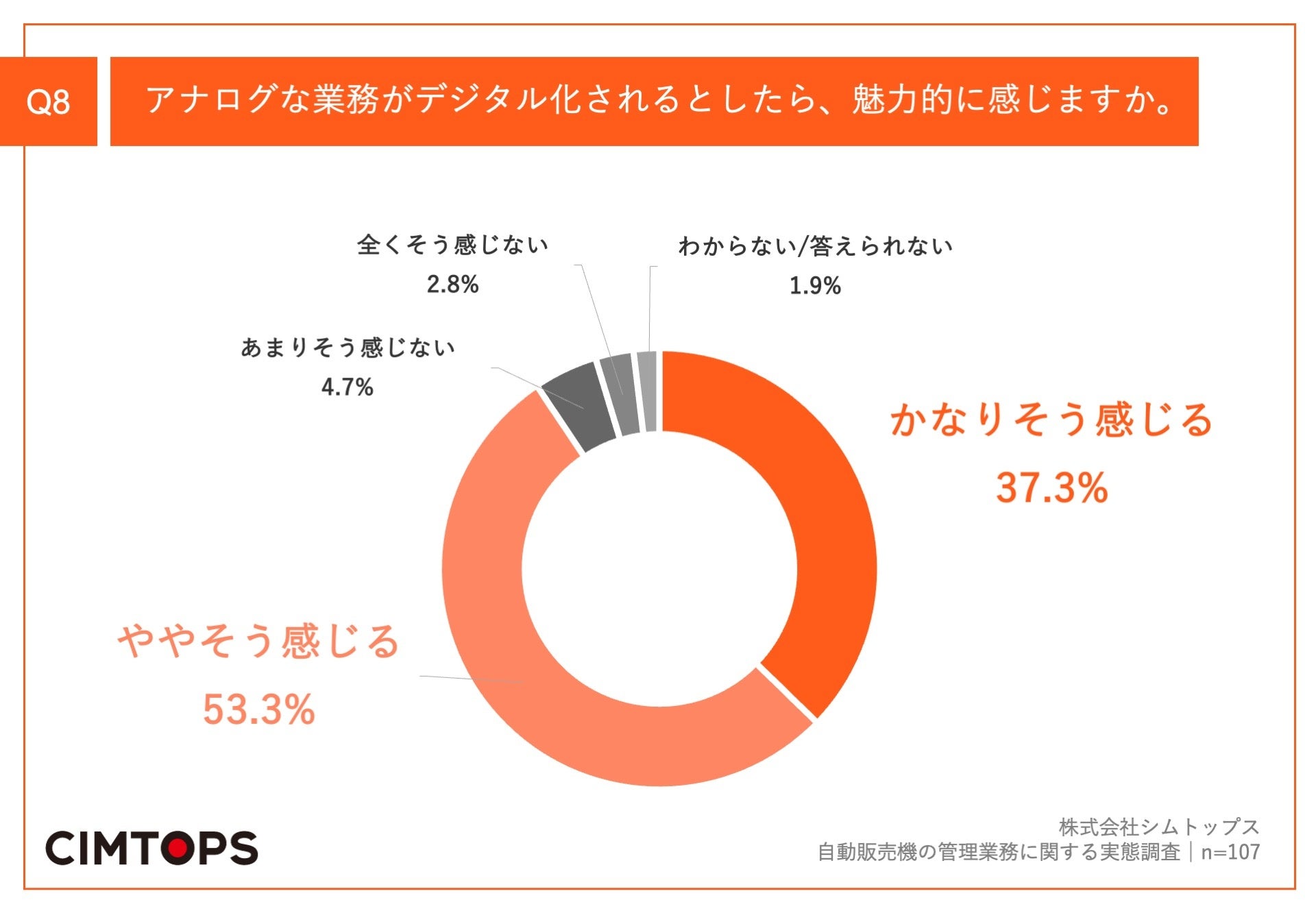 Q2で「アナログな業務はない」以外を回答した方に、「Q8.アナログな業務がデジタル化されるとしたら、魅力的に感じますか。」(n=107)と質問したところ、「かなりそう感じる」が37.3%、「ややそう感じる」が53.3%という回答となりました。