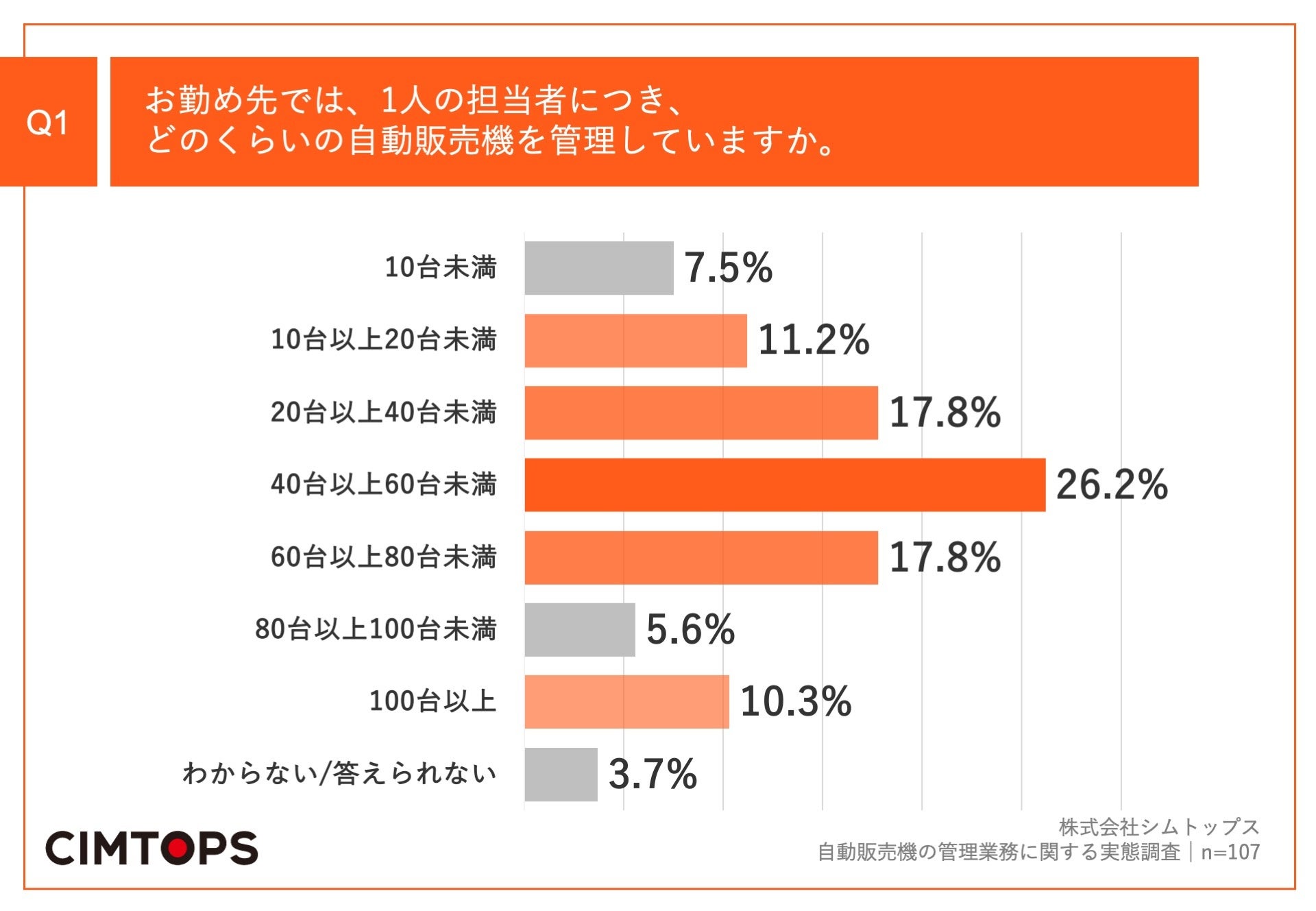 「Q1.お勤め先では、1人の担当者につき、どのくらいの自動販売機を管理していますか。」(n=107)と質問したところ、「40台以上60台未満」が26.2%、「20台以上40台未満」が17.8%、「60台以上80台未満」が17.8%という回答となりました。