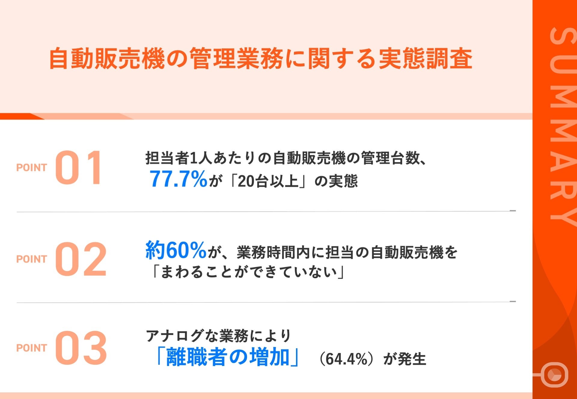 「20台以上」の自動販売機を管理している担当者が77.7%に上ることは、驚異的な結果であり、現場の負担軽減に向け、早急な対策が求められています。